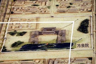 ![]() 「冷然院跡」と刻まれた石標 ![]() ![]() 【参照】平安時代の冷泉院の復元図(京都市平安京創生館、展示パネルより) |