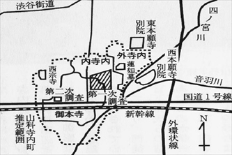 ![]() ![]() ![]() 「蓮如上人御往生之地」の石標 ![]() ![]() 本堂 ![]() ![]() 本堂 ![]() 本堂 ![]() 手水舎 ![]() 手水舎「放鶯山」の水盤 ![]() 鐘楼 ![]() 梵鐘 ![]() 「蓮如上人放鶯の像」 ![]() 「蓮如上人放鶯の像」、鶯が放たれた後の空の鳥籠 ![]() 月見石 ![]() 句碑 ![]() 「往生旧地 西宗寺」の石標 ![]() 【参照】山科本願寺寺内町推定復元図(洛東高校本・西宗寺本より、『洛東探訪』より一部抜粋)、西宗寺は寺内町の北西端に当たる。 |