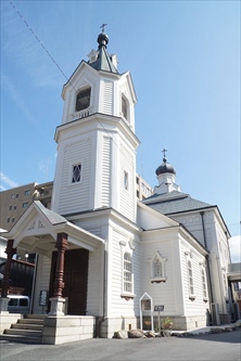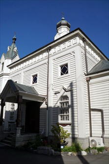 西より東に玄関・鐘楼、啓蒙所(けいもうじょ、洗礼前の者の場所)、聖所(せいじょ、信者の立つ場所)、至聖所(しせいじょ、司祭者らのみが入る場所)の4室が一直線に並ぶ。各室は各々異なる長方形の部屋であり、これらが接合している。聖所は横幅が広いため、この部分を中心にして平面的には十字架形(船型)をしている。玄関上には3層(22m)の鐘楼がある。屋根は葱坊主型のドーム屋根(クーポル)でありギリシア十字架が立つ。聖所の屋根は寄棟造、頂部に八角形平面の小塔があり、葱坊主型のドーム屋根に十字架が立つ。建築様式は、石材を使わない木造のロシア・ビザンチン様式であり、和洋折衷の建築になる。八角塔、ドーム屋根、独特の窓回り装飾が見られる。室内は白漆喰、下見板張。外壁は白壁、木造平屋建、最大幅15m、奥行27.21m、総高22.3m、屋根は銅板葺。217.78㎡。
