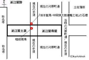 ![]() 「坂本龍馬・中岡慎太郎遭難之地」の石標 ![]() 参考 『京都・観光文化 時代MAP』 |