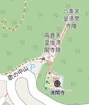 ![]() 「六條天皇陵」「高倉天皇陵」の石標 ![]() 高倉天皇の後清閑寺陵 ![]() 後清閑寺陵 ![]() 後清閑寺陵、覚明水 高倉天皇陵、六条天皇陵、清閑寺、 OpenStreetMap Japan |