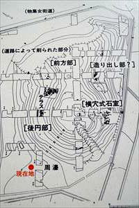 ![]() 「史跡乙訓古墳群 物集女車塚古墳」 ![]() ![]() ![]() 車塚古墳北側 ![]() ![]() 二段築成のテラス(平坦)部 ![]() 前方後円墳の平面形状 ![]() 全景図、北は左斜め上になる、上に前方部、下に後円部、説明板より ![]() 玄室、石棺(下)、説明板より ![]() 石室床面、小石が敷かれていた。説明板より ![]() 床面下部の排水溝、説明板より ![]() 石室断面図、右端が石室になる。説明板より ![]() 上から見た石室見取り図、説明板より ![]() 復元された排水溝 ![]() |