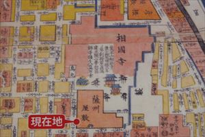 ![]() 薩摩藩邸跡の石標 ![]() 相国寺の南に「薩州屋敷」と記されている。(「改正京町御絵細身大成」、1868年)(同志社大学の説明板より) |