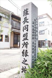 室町通の北端(室町頭)にあたる上京区森之木町(もりのき-ちょう)に、「小松帯刀寓居跡(こまつ-たてわき-ぐうきょ-あと)」の石標が立てられている。 石標には「薩長同盟所縁之地」、「近衛家別邸近衛家別邸 御花畑御屋敷跡」とも刻まれている。幕末の「薩長同盟」は、この地で締結された。 ◆歴史年表 江戸時代後期、1866年、旧1月21日、小松帯刀は寓居していた「御花畑(近衛家別邸)」に西郷隆盛と木戸孝允を招き、「薩長同盟」を締結した。茶室「有待庵(ゆうたいあん)」が大久保利通邸(上京区)に移された。 1867年、旧5月、帯刀は、寓居に中岡慎太郎、乾(板垣)退助の訪問を受けた。西郷と共に武力討幕論を聞く。旧5月21日(新6月23日)、薩摩藩と土佐藩間で「薩土密約(薩土討幕の密約)」が締結された。 現代、2016年、5月、西郷隆盛研究家・原田良子は、京都行政文書(京都府立総合資料館所蔵)により、御花畑(近衛家別邸)の場所、規模、所有者などを発見した。御花畑(近衛家別邸)は、現在地(上京区森之木町)に特定された。 2017年、3月、NPO法人京都歴史地理同考会により現在の石標が立てられた。 ◆小松 帯刀 江戸時代後期-近代の薩摩藩士・政治家・小松 帯刀(こまつ-たてわき、1835-1870)。男性。肝付清廉(きもつき-きよかど)。父・薩摩藩門閥・兼善(かねよし)の3男、後に薩摩藩士・小松清猷(こまつ -きよもと)の養子になり帯刀清廉と称した。1861年、島津久光の側詰で側役勤になり、大久保利通らの藩内下級武士を要職に就かせる。利通ら誠忠組の指導者になる。1862年、久光の率兵上洛に随従し、帰藩し家老になる。藩政改革、薩内公武合体運動を利通らと推進した。1864年、禁門の変に参加し、戦後処理も行う。1866年、寓居である御花畑(近衛家別邸)で、隆盛とともに長州藩士・木戸孝允との間に「薩長盟約」を結んだ。1867年、旧5月、京都の寓居を中岡慎太郎、乾(板垣)退助が訪れ、隆盛と共に武力討幕論を聞く。寓居で「薩土密約(薩土討幕の密約)」が締結された。旧6月、隆盛、利通と共に後藤象二郎との間に「薩土盟約」を交わした。帯刀も立ち会う。(旧10月に破棄)。旧10月、隆盛、利通と共に討幕の密勅を受け大政奉還の実現を朝廷、将軍・徳川慶喜(よしのぶ)に進言した。長州藩と討幕戦略を協議し帰藩した。1868年、王政復古の政変では、鹿児島に居た。旧1月、上洛し新政府参与、総裁局顧問、外国官副知事になる。1869年、利通らと版籍奉還を画策した。1870年、大阪で病没した。36歳。 ◆御花畑 江戸時代後期、1866年旧1月21日に締結された「薩長同盟」は、「二本松薩摩藩邸( 現在の上京区、同志社大今出川校地内)」の地だったとされていた。 その後、薩摩藩家老・小松帯刀邸であることが判明する。小松邸とは薩摩藩が借りた五摂家筆頭・近衛家別邸の「御花畑」だった。別邸は「室町頭(むろまちかしら」にあるとされ、当初は室町頭町(室町通上立売上ル)の地とみられた。現在の石標の立つ位置の南方向になる。 現代、2016年に発見された、近代、1871年の行政文書により、「室町頭」とは室町通北端を意味し、鞍馬口通との交差付近であることが特定された。西郷隆盛の文書に、邸内に「御花畠水車」があったことが記されており、邸内に何らかの水が引かれていたとみられていた。かつて、森之木町には、禁裏へ水を供給した「御泉水流(禁裏御用水、御所用水)」の流れがあり、傍証になった。水路は北から南に下り、東行、南下しながら御所に導かれていた。 御花畑の範囲は、北は鞍馬口通88.36m、西は室町通56.96m、南は中町通136.92m、東は烏丸通まであった。東端の南側半分弱ほどは烏丸通を越え、東側に突起しており上御霊中町、小山町まで及んでいた。敷地は1796坪(5937.㎡)の広大だった。門は北、南東、南西の3カ所に開き、門番所もあった。邸内には瓦平屋建、瓦住居2階建、土蔵、湯殿雪隠、瓦平屋長屋、納屋、社などが建てられていた。 なお、御花畑には茶室「有待庵(ゆうたいあん)」があった。3畳、平屋、アカマツの床柱が使われていた。江戸時代後期、1866年に茶室は大久保利通邸(上京区)に移される。茶室内では政治的な密議が行われ、利通は岩倉具視とも会談したという。 ◆薩長同盟 「薩長同盟(さっちょう-どうめい)」は、薩長連合、薩長和解連合ともいわれる。 江戸時代後期、1863年旧8月、討幕のための薩摩、長州両藩の軍事同盟の締結をいう。 長州藩は、薩摩藩の公武合体論に押され、次第に朝廷に対する支配権を失う。1863年、長州藩は下関海峡で列強商船砲撃事件を引き起こした。その報復のために、四国艦隊(イギリス・フランス・オランダ・アメリカ 土佐藩出身の坂本龍馬(1836-1867)、中岡慎太郎(1838-1867)が両藩を仲介し、1866 年旧1月21日、討幕のための提携を結ぶに至る。御花畑(近衛家別邸)で薩摩藩の小松帯刀(1835-1870)、西郷隆盛(1828-1877)、大久保利通(1830-1878)、長州藩側の桂小五郎 (1833-1877、木戸孝允)らが会見した。この時、長州再征のための対処である6ヵ条攻守同盟が結ばれている。 1866年