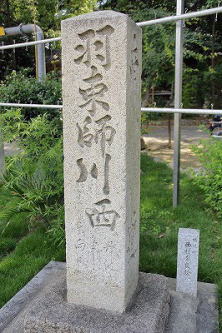 ![]() 羽束師川の碑、かつては久我綴道四ツ辻にあった。その後、ゆかりの地である当境内に移転された。 |