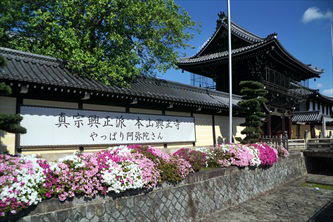 興正寺(こうしょう-じ)は、西本願寺の南に隣接している。山号は円頓山(えんとんざん)という。 真宗興正派の本山。本尊は阿弥陀如来。 ◆歴史年表 創建、変遷の詳細は不明。 鎌倉時代、1212年? 、越後流罪から帰京した開祖・親鸞(1173-1263)の草庵が結ばれた京都・山科に創建されたともいう。(寺伝)。異説もある。 第84代・順徳天皇(在位: 1210-1221)により、厩戸王(うまやどのおう、聖徳太子)にまつわる「興隆正法」の勅願に因み、当初は寺号を「興隆正法寺」、後に「興正寺」としたという。「正しい法を興し栄えさす」の意がある。 1324年/1320年、7世・了源(1295-1335)が、山科に寺を建立したともいう。覚如(1271-1351)は寺名を興正寺と命名した。存覚が彼岸会供養を行う。(『存覚一期会』) 1328年頃、了源により、京都・今比叡汁谷(しぶたに、渋谷、現京都国立博物館付近)に移転した。「阿弥陀佛光寺」の寺号を第96代・後醍醐天皇より贈られた。略して佛光寺の寺名とした。佛光寺はその後、東山の地に移る。 室町時代、1469年、13世・光教は、経豪に寺務を譲る。(『渋谷歴世略伝』)。佛光寺は妙法院と関係深く、本願寺の蓮如に近づいた。このため、経豪は比叡山延暦寺により追放される。無碍光流と批判された。(「反古裏書」) 1481年/1482年/文明年間(1469-1486)、経豪は寺務を弟・経豪に譲る。経豪は済光寺を脱して、蓮如に帰参した。蓮如は経豪に蓮教の名を与える。ともに、山科西野の地に興正寺(佛光寺旧称、興隆正法寺)を興す。(「反古裏書」) 1532年、六角氏と法華宗徒による焼き討ちにより、山科本願寺とともに焼失した。 1535年、蓮秀は、本願寺の一家衆に列せられた。(『私心記』) 1567年、本願寺11世・顕如の次男・顕尊)が入寺している。以後、本願寺との関係が深くなる。 安土・桃山時代、1568年、本願寺が門跡寺院になり、興正寺も本願寺末寺別格として脇門跡寺院になる。(「興正寺文書」)。本願寺に次ぐ位置を占めた。 1585年、大坂天満に移転した天満本願寺とともに移転し、真宗興正寺として再興された。 1591年、豊臣秀吉により、本願寺とともに京都の現在地に再び戻り、再興された。(『大谷本願寺通記』) 1602年、本願寺の東西分裂後は、西本願寺に属した。 江戸時代、1607年、8世・顕尊は、東本願寺への転派を図る。 承応年間(1652-1655)、西本願寺との本末論争を繰り返す。 1653年、19世・准秀は、西本願寺内での西吟、月感の争論で月感に付き、大坂・天満別院に移る。(「学寮造立事」) 1655年、江戸幕府の裁決により、准秀ら興正寺関係者は流罪になる。准秀は越後に逼塞された。 1754年、22世・寂永は、独自に朝廷に請い、大僧正になる。 1772年、本堂造営に際して本山称号問題が起こる。西本願寺は幕府に訴えた。 1788年、天明の大火で門主自ら指揮し、防火活動を行った。(『花紅葉都咄』) 1811年、幕府により、西本願寺末寺とする裁許が下る。本堂を再建した。(『真宗法脈史』) 1830年、旧7月、京都大地震(文政の大地震)で、筑地塀が崩壊、対面所が倒壊した。(『京都地震実録』) 1846年、27世・本寂は、第120代・仁孝天皇皇后・新朔平門院より宝蔵建立のために寄進を受け、勅額も受けた。 1864年、禁門の変の際に、長州の僧侶による金剛隊6人が逃げ込む。本寂は庇い、醍醐・三宝院に逃がす。新撰組が西本願寺屯所より不動堂村屯所に移る際に、200両を提供した。 1867年、旧12月7日、海援隊・陸奥陽之助らは、紀州藩家老・水野大炊頭を興正寺に襲う。新撰組・土方歳三、原田左之助らがこれを防いだ。(天満屋騒動)。幕末は、尊王派の立場にあった。(『摂信上人勤王護法録』) 近代、1873年、本寂は、西本願寺などの真宗大教院分離脱退運動に反対する。 1876年、真宗興正派本山として西本願寺より独立した。真宗興正派の本山になる。(『明如上人伝』『摂信上人勤王護法録』) 1902年、全焼失した。 1912年、現在の伽藍が再興される。 2018年、大阪府北部地震により御影堂、興正会館などが被害を受けた。 ◆了源 鎌倉時代後期-南北朝時代の僧・了源(りょうげん、1295-1336)。男性。号は空性(くうしょう)。父・興正寺4世了海の3男、7世を継ぐ。後醍醐天皇より仏光寺の名を授かり改称した。布教中に伊賀山中で殺された。また、武家の家人の中間。覚如にまなび興正寺を建立した。焼失後、再興し、存覚から仏光寺の名をあたえられた。仏光寺教団の基礎を築いた。41歳。 ◆経豪 室町時代中期-後期の浄土真宗の僧・経豪(きょうごう、1451-1492)。男性。法名は尭円。京都に生まれた。父・仏光寺12世・性善の長男。1469年、13世を継ぐ。1481年、末寺を率い仏光寺より本願寺派の蓮如に帰依する。蓮教と改名、山科に仏光寺の旧称を号した興正寺を建てる。42歳。 ◆建築 大師堂、阿弥陀堂、大門、書院などは、近代、1912年に建てられた。 ◆新撰組 幕末、当寺は、紀州藩主・徳川茂承(もちつぐ)の宿所になっていた。 1867年旧4月23日、海援隊の船「いろは丸」と紀州藩の軍艦「明光丸」が備中国笠岡諸島で衝突する。その後、い