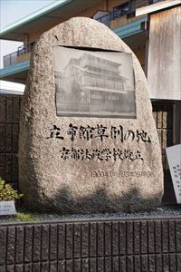 東三本木丸太町上ル東側に「立命館草創の地(りつめいかん-そうそう-の-ち) 京都法政学校設立(きょうと-ほうせい-がっこう-せつりつ)」の碑が立つ。近代に、中川小十郎は、旗亭(きてい、料理屋・宿屋)「清輝楼(せいきろう)」で開校した。 旗亭は、桂小五郎(木戸孝允)と幾松(後の木戸夫人)の逸話がある「吉田屋(よしだや)」の後継ともいう。 ◆歴史年表 近代、1900年、5月19日、官僚・教育家・中川小十郎は、私立「京都法政学校」を開校した。旗亭「清輝楼」を仮校舎とした。6月4日/5日、講義が開始される。(『立命館創立五十年史』)。立命館大学の前身になる。 1901年、12月30日、京都法政学校は新校舎(広小路河原町、上京区中御霊口町)に移転した。(『立命館創立五十年史』) 現代、1997年まで、清輝楼の後継とされる旅館「大和屋」は現在地に存在していた。 2000年、3月、立命館創立100周年を記念し、学校法人 立命館により石碑・副碑が立てられた。 ◆中川 小十郎 江戸時代後期-近代の官僚・教育家・中川 小十郎(なかがわ-こじゅうろう、1866-1944)。男性。本名は重興。京都生まれ。父・中川禄左衛門、母・さきの長男。6歳の時、中川武平太の家に養子に入る。養父が佐賀から招いた漢学者・田上綽俊の私塾に、書生として住み漢詩などを学ぶ。1878年、東京の叔父・中川謙二郎から学問修業の誘いを受けた。1879年、叔父・中川謙二郎の自宅で、岡田良平(後の文部大臣)、一木喜徳郎(後の東京帝国大学教授)らと同居した。夏目漱石(小説家)と帝国大学法科大学(現・東京大学法学部)を目指した。1893年、東京帝国大学で法学、経済学を修めて卒業する。恩師・木下廣次(後の京都帝国大学初代総長)の紹介で文部省へ入省する。文部省大臣・井上毅文部大臣のもとで官立学校の制度作りに参加した。1894年、西園寺公望(きんもち)が文部大臣に就任し、秘書官に抜擢される。1897年、廣次とともに京都帝国大学の創立に参加し、初代事務局長になる。教官選任、会計事務を取り仕切る。1898年、成瀬仁蔵とともに、日本女子大学の創立に関わる。同年、政権交代を契機に文部省を退職した。成瀬の紹介で実業家に転身し、経営不振の大阪・加島銀行理事として再建に尽力した。1899年、10月、私立「京都法政学校」の創立のために、加島屋の実業家・広岡浅子、西園寺の実弟・住友友純からの大口寄附などを得る。1900年、京都法政学校が鴨川河畔「清輝楼」で開校した。1900年-1913年、立命館の学監になる。1905年、京都法政学校は西園寺から「立命館」の名称を受け継ぐ。1906年、西園寺の首相就任に伴い、小十郎は首相秘書官、その後も元老の私設秘書として仕えた。その後、朝日生命副社長、再び京都帝大書記官、樺太庁事務官などを歴任する。1912年、台湾銀行副頭取、1913年-1931年、立命館館長になる。1920年、台湾銀行頭取になる。1925年、貴族院議員になった。1928年、近衛隊を組織し国家主義に傾注する。1931年-1944年、立命館初代総長になる。1933年、滝川事件の際に、京都帝国大学を辞職になった憲法学者・佐々木惣一教授らを立命館に迎えた。同年、貴族院議員などを歴任した。79歳。 ◆中川 謙二郎 江戸時代後期-近代の教育者・中川 謙二郎(なかがわ-けんじろう、1850-1928)。男性。丹波桑田郡の生まれ。中川小十郎の叔父になる。1868年、西園寺公望の山陰道鎮撫使総督に従軍する。1869年、西園寺が創設した家塾「立命館」に学ぶ。後に東京開成学校を卒業した。1879年、向学のために中川を誘い、東京の自宅に預かる。新潟学校、学習院、東京女子師範の教諭を歴任した。1901年、文部省視学官に任じられる。後に、仙台高工校長、東京女高師(現お茶の水女子大)校長になる。79歳。 ◆西園寺 公望 江戸時代後期-近代の貴族・政治家・西園寺 公望(さいおんじ-きんもち、1849-1940)。男性。幼名は美麿、号は陶庵。京都の生まれ。父・公家・徳大寺公純、母・斐子の次男。西園寺家を継ぐ。1868年、王政復古で、1867年、参与になる。戊辰戦争(1868-1869)に山陰道鎮撫総督などとして従軍した。1869年、邸内に家塾「立命館」を創設した。1871年/1870年、パリ・コミューン渦中のパリ第4大学(ソルボンヌ)に留学し、後に卒業した。クレマンソー、中江兆民らと交わる。1880年、帰国する。1881年、参事院に入る。明治法律学校(現・明治大学)を創立した。明治法律学校講師になる。東洋自由新聞社長になり、自由民権を主張する。兄・侍従長・徳大寺実則の説得で辞職した。1882年、憲法調査のために、伊藤博文に随いて渡欧した。以降、各国公使、賞勲局総裁になる。1884年、公爵、1885年、オーストリア公使などを歴任した。1891年、貴族院副議長、1894年から、第2次・第3次伊藤内閣文相になる。1900年、枢密院議長、1903年、立憲政友会総裁に就任した。1906年、第1次内閣、1911年、第2次内閣を組織した。1912年、元老になる。2個師団増設問題で陸軍と対立した。1914年、総裁を辞職する。1919年、ベルサイユ講和会議首席全権を務めた。1920年、公爵になる。著『西園寺公