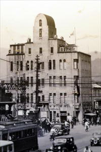 四条大橋の東詰南側に「レストラン菊水(きくすい) 」がある。 京都の西欧料理の草分け的な存在であり、独特の外観を持つ洋館が建てられている。 ◆歴史年表 近代、1916年、初代・奧村小次郞が、現在地に割烹業の「菊水館」を創業した。当初は瓦煎餅屋の建物を改装して使った。 1926年、現在の洋館が竣工する。 太平洋戦争(1941-1945)中、2代目・小四郎は、配給食だけで営業を続けた。 現代、1945年、戦後に進駐軍相手の酒保(進駐軍の許可を得たパブ)に指定され、営業を続けた。京都初の屋上ビアガーデンを開く。 1955年、3代目・忠の時、屋号を「菊水館」から「レストラン菊水」、会社名を「株式会社菊水」にした。店の1階部分の改装に着手する。 1974年、1階部分を全面ガラス張りし、オープン・カフェ形式のレストラン・パーラーに改装した。 1996年、5月、建物は国登録文化財に指定されている。 ◆奧村 小次郞 近代の実業家・奧村 小次郞 (おくむら-こじろう、1886-?)。詳細不明。男性。父・奧村小三郞の長男。1874年、家督を相続した。瓦煎餅屋を営む。1916年、割烹業の菊水館(川端通四條上ル川端町)を営む。その後、京都製氷会社監査役として京都府多額納税者になった。1926年、現在の洋館が竣工した。 ◆松村 次郎 近代の建築家・松村 次郎(?-? )。詳細不明。1926年、レストラン菊水を設計した。 ◆建築 建物は、近代、1926年に建てられた。設計は松村次郎(上田工務店)、施工は上田工務店による。創業者の奥村小次郎は、上田工務店の上田辰三とともに、日本国内、当時の西洋文化の最先端だった上海で建物などについて見聞した。 外観は表現主義の意匠を基調に、内外の様々な新様式を取り入れている。アール・デコ、スパニッシュ様式の影響もある。正面の塔屋は屋根が曲線であり、左右非対称であり、スペイン風瓦が葺かれている。当時の日本では非常に珍しいものだった。 1階部分の外壁は凹凸のあるタイル貼り、2階以上はモルタル仕上げになっている。タイル部分には陶製の人面像が飾られている。当初は1階にパーラー、2階にカクテルバー、3階に宴会場、4階に個室レストランがあった。 鉄筋コンクリート造、地上5階地下1階、建塔屋付、建築面積203㎡。 その後、内部は改装されている。現代、1996年、国登録文化財に指定されている。 ❊原則として年号は西暦を、近代以前の月日は旧暦を使用しています。 ❊参考文献・資料 ウェブサイト「文化庁 文化財データベース」、ウェブサイト「レストラン菊水」、『京都の洋館』、ウェブサイト「『人事興信録』データベース」ウェブサイト「コトバンク」 |