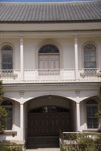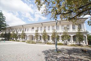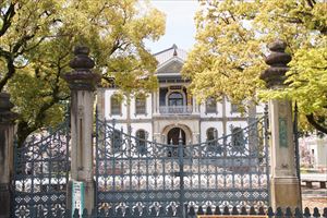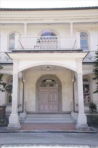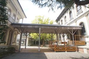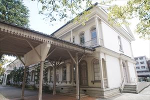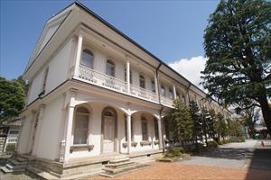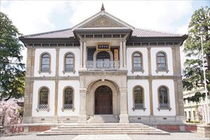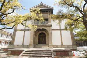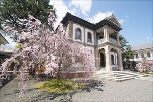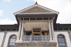龍谷大学大宮学舎の龍谷大学本館(りゅうこくだいがく-ほんかん)は、日本人大工の手による擬洋風建築様式であり、その完成度は高いといわれている。 講堂には本尊・阿弥陀如来を安置している。 ◆歴史年表 近代、1877年、1月、本願寺21世・明如上人の時に本館は起工した。 1879年、1月、竣工する。5月、落成式が行われた。 1880年、夏に第122代・明治天皇が行幸した。 現代、1964年、5月、国の重要文化財に指定されている。 1992年、全面解体修復が始まる。 1997年、5月、改修が終わる。 ◆建築 ◈龍谷大学本館(重文)は、近代、1877年1月に、本願寺21世・明如上人の時に起工している。1879年1月に竣工した。設計者名・施工者は不明。なお、建築中に、第122代・明治天皇行幸の休憩地として大幅な設計変更をしている。完成後は本願寺大教校として使用された。現代、1964年5月に、国の重要文化財に指定された。1992年-1997年に全面解体修復が行われている。現在は、勤行・法要、各種の行事・式典、仏前結婚式などにも利用されている。 東面して建てられている。外観は、日本人が設計した擬洋風建築の様式になる。近代、明治期(1868-1912)初期に、大工棟梁が日本の伝統的な技術を用い、西洋建築を表現した和洋折衷の様式をいう。東北・甲信越に多く見られる。関西では先駆的な作品であり、規模・施工においても完成度が高いといわれている。京都の宮大工らは、神戸居留地の西洋建築を見学し技法を学んだとみられている。 車寄上部に三角破風(ペディメント)があり、木造部分は日本の伝統的な工法による。四隅に石が積まれている。木造石貼であり、石材は木部に貼り付けられている。当初は、外国人が居住した横浜などで用いられ工法による。現存するのは本館のみになる。補強用のボルトなど金物も多用されており、屋根を支える小屋組にキングポスト構造(三角形の構造を構成するトラスのうち、中央に真束と呼ばれる支柱の立つ形式)が採用されている。 柱・アーチ・手摺などに洋風の意匠を施した。鉄製門扉・窓・手摺などは、ロンドンから取り寄せている。屋内の細部装飾には、日本の伝統的な菊・桐などの植物・雲などが多用されている。講堂の柱頭の彫刻は、西洋建築の葉を表すアカンサス(古代ギリシャ時代の柱のモチーフ)を真似ている。階段の親柱の彫刻も洋風になっている。 内部1階には十字型廊下で仕切られた左右同形の室が6室ある。2階には東側に講堂があり、本尊・阿弥陀如来像を安置する。西側に階下と同形に2室がある。 本館の西側には窓は開けられていない。浄土真宗の寺院と同じ造りになっている。建物の下部に卍模様の通用口だけが開けられている。 木骨石貼寄棟造、2階建、木造石貼、桟瓦葺、建築面積516.8㎡。 ▪2階の講堂(100畳)は、当初、学生は正座して講義を受けていた。このため、窓の位置が低い。柱頭玄関壁は、漆喰塗で、柱もすべて塗り込めた西洋式の大壁造になる。窓・出入口の枠は欅材で造られ、木目が浮かび上がるワニス(透明塗料)仕上げになる。部屋の天井にクロスが貼られ、下地に和紙を使った金襴織になる。クロスは、明治天皇皇后・昭憲皇太后(1849-1914)の寄贈によるという。現在は、龍村美術織物により、材料、織り方、色などを調査して復元された。 ▪2階北西の貴賓室は、近代、1880年に明治天皇(1852-1912)が行幸し、休憩室として使われた。ほとんどの窓は上げ下げ式になっている。蝶番・締金物などが入手困難なためだった。窓の位置も洋館に比べやや低く、扉の取っ手の位置も低い。僧が袈裟姿で座り、扉を開けられる高さになっている。カーペットの小花唐草文様なども再現されている。カーテンポールは創建当時のものになる。カーテンは大正期(1912-1926)のものに復元されている。 ◈本館の南北には、近代、1877年に建てられた学寮「北黌(ほっこう)」「南黌(なんこう)」が建つ。 いずれも木造切妻造、2階建。桟瓦葺。 ◈建物の周囲には、石造の表門、石垣が巡らされている。当初は上に鉄柵が設けられていた。 ◈門(重文)、門衛所(重文)が建てられている。 ◆文化財 ◈貴賓室に、狩野派11代・狩野英信(法眼祐清、1717-1763)作の松の金屏風が立てられている。明治天皇を迎えた際に飾られたという。 明治天皇が使ったという椅子もある。 ◈扁額「真宗學庠」は、近代、1830年に第20代・広如(1798-1871)による。 ◆龍谷大学 龍谷大学の前身は、江戸時代前期、1639年に第13世・良如(1613-1662)が、本山境内(下京区)に創設した「本願寺(西本願寺)学林(がくりん)」になる。末寺僧侶の教育機関であり学寮だった。1640年に講義が始まっている。 その後、境外の大宮通東側、さらに興正寺の南側に移る。承応年間(1652-1655)の興正寺との争論(承応鬩牆/閴牆[げきしょう])に起因し、1655年に幕命により破却されている。その後、仮学寮での私的な講義を経て、1695年に東中筋花屋町(現・下京区学林町)で学林として再興される。近代、1872年の学制改革に伴い、1876年に「大教校」に改められ