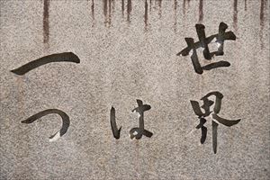 国立京都国際会館の北東の道路脇に、「世界は一つ(せかい-は-ひとつ)」と刻まれた大きな石碑が立つ。 理論物理学者・湯川秀樹の揮毫による。核軍縮・平和・世界連邦運動にも関わった。 ◆歴史年表 現代、1975年、2月、世界連邦京都婦人の会(会長・湯川スミ)により、石碑「世界は一つ」が寄贈され建立された。 1975年、8月、国立京都国際会館で「第25回パグウォッシュ・シンポジウム」が開かれた。湯川が主催し、開会式に参加している。 ◆湯川 秀樹 近現代の理論物理学者・湯川 秀樹(ゆかわ-ひでき、1907-1981)。男性。東京の生まれ。父・地理学者・小川琢治、母・小雪の3男。1908年、父が京都大学教授になり、京都に移る。1913年、京極尋常小学校に入学した。1919年、京都府立第一中学校に入学する。1923年、一中4年を修了し、第三高等学校に入学した。1926年、同校を卒業し、京都帝国大学理学部物理学科に進学する。1929年、帝大を卒業し、同大学理学部副手として理論倫理学の研究に従事した。1932年、湯川スミと結婚し湯川姓になる。京都大学理学部講師になり、量子力学の講義を担当する。1933年、大阪帝国大学講師になった。西宮市苦楽園に移り住む。1934年、大阪大学理学部専任講師になる。第1報「素粒子の相互作用について」で、核力とβ崩壊を媒介する場の量子として、新粒子(中間子)の存在を予言した。1936年、大阪大学助教授になる。「K電子捕獲の理論」を提唱する。 初著『ベーター線放射能の理論』を出版した。1937年、アメリカ合衆国の物理学者・アンダーソンが中間子の存在を宇宙線に発見した。湯川は物理学者・坂田昌一らと「中間子場理論」を展開した。1938年、共著『素粒子の相互作用について』を発表し、理学博士を授与される。服部報公賞を受賞した。1939年、京都大学教授になる。1940年、素粒子論で学士院恩賜賞を受賞した。1941年、 野間学術賞を受ける。1942年、東京帝国大学教授を兼任する。 1943年、文化勲章を受章する。1945年、戦後すぐに欧文専門誌"Progress of Theoretical Physics"を創刊し、高い評価を受けた。1947年、素粒子に時空的な広がりをもたせた「非局所場の理論」を提唱した。1948年、プリンストン高等研究所客員教授として渡米した。1949年、 7月、コロンビア大学教授になり、ニューヨークに移る。10月、日本人として初めて、核力に関する中間子理論によりノーベル物理学賞を受賞した。1953年、帰国する。京都大学基礎物理学研究所の創設に伴い、初代所長に任じられた。 京都市名誉市民になる。1954年、アメリカ合衆国の水爆実験に衝撃を受ける。1955年、日本ユネスコ国内委員会委員、社団法人日本物理学会会長になった。7月、核兵器に反対したロンドンでの「ラッセル・アインシュタイン宣言」の共同署名(11人)の一人になる。「世界平和アピール七人委員会」を結成した。1956年-1557年、原子力委員会委員を務めた。1957年、7月、ラッセル・アインシュタイン宣言に基づき、カナダでの「第1回パグウォッシュ会議」(22人)に、友人・物理学者・朝永振一郎、核物理学者・小川岩雄とともに出席した。パリ大学名誉博士を授けられる。1958年、京都市左京区に移る。1962年、天龍寺(右京区)で、朝永、坂田とともに呼びかけ人になり、日本版パグウォッシュ会議の「科学者京都会議」が開催される。1966年、 「原子論と空間時間の分割性」を発表し、素領域理論を提唱した。1967年、 西ドイツ国プール・ル・メリット勲章を受賞した。モスクワ大学名誉博士を授けられる。1970年、京都大学を定年退官し、同大学名誉教授になる。1971年、 『湯川秀樹自選集』全5巻を出版した。1975年、京都で「第25回パグウォッシュ・シンポジウム」(36人)が開かれ、完全核軍縮の「湯川-朝永宣言」を発表した。1977年、勲一等旭大綬章を授けられる。1978年、 東京で開催された「第19回エネルギー物理学国際会議」の会長になる。1979年、英文学術論文集"Hideki Yukawa Scientific woks"を出版した。1981年、京都市の自宅で亡くなる。74歳。 原子核は陽子と中性子からなる。さらに、陽子・中性子を互いに結び付ける何らの力として、新粒子があるとした。新粒子の中間子は、核子(陽子・中性子の総称)の間に働く、核力を媒介する素粒子として導入された。さらに、中間子が電子とニュートリノに崩壊し、原子核のβ崩壊も統一的に説明する可能性を与えた。以後、素粒子論の領域が発展する。 反核・平和・世界連邦運動にも積極的に関わる。著『素粒子』、『湯川秀樹自選集』など。 墓は知恩院(東山区)にある。 ◆湯川 スミ 近現代の湯川 スミ(ゆかわ-すみ、1910 -2006)。女性。本名は湯川澄子。大阪市生まれ。父・医師・湯川玄洋、母・みちの次女。1928年 、大阪府立大手前高等女学校本科(現・大阪府立大手前高等学校)を卒業した。1932年、 小川秀樹と結婚し、夫・秀樹は入り婿になり湯川に改姓する。1933年、 長男出産、1934年、 次男を出産した。1948年、秀樹がプリンストン高等科学研究所の教授として招かれ、スミも渡米し理