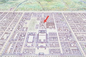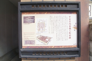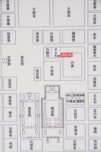 ![]() 京都市考古資料館の説明板 ![]() ![]() 平安宮復元図、現在地は赤点部分、その右下に内裏、京都市考古資料館の説明板より ![]() 平安宮復元図、現在地は赤い矢印部分、その右下に内裏、京都市考古資料館の説明板より |