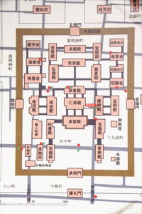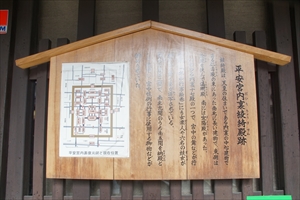 ![]() 「平安宮内裏綾綺殿跡」の石標 ![]() 説明板 ![]() 平安宮復元図、黄土色の四角部分が内裏内郭回廊、現在地は中央付近の赤字部分、説明板より |