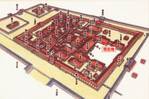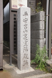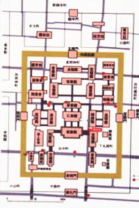 ![]() 「平安宮 内裏 宜陽殿跡」の石標 ![]() 「源氏物語ゆかりの地」の説明板 ![]() 平安宮復元図、黄土色の四角部分が内裏内郭回廊、現在地は中央やや右の赤字部分、「源氏物語ゆかりの地」の説明板より ![]() ![]() |