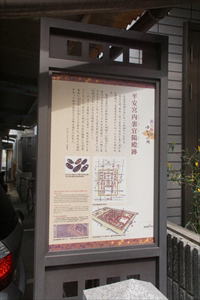 浄福寺通下立売上ルに平安宮 内裏 宜陽殿跡(へいあんきゅう-だいり-ぎようでん-あと)の石標、京都市の「源氏物語ゆかりの地」の説明板がある。 平安時代、この地には宜陽殿があり、天皇所持の書物・歴代の御物が収蔵されていた。議所では公卿会議が行われた。 ◆歴史年表 平安時代、この地に宜陽殿が建てられた。 827年、その存在が確認できる。 現代、2007年、12月、全京都建設協同組合創立50周年記念として石標を立てる。 2008年、3月、京都市は「源氏物語ゆかりの地」の説明板を設置した。 ◆宜陽殿 宜陽殿(ぎようでん)は、平安京内裏十七殿の一つになる。儀陽殿とも記した。紫宸殿の東、綾綺殿の南にあった。南にある春興殿と並び、西側にある校書殿(きようしよでん)、安福殿とは相対した。内裏造営時からあった建物とみられている。 母屋を塗籠(ぬりごめ)につくり、納殿(おさめどの)と呼ばれた。天皇所持の書物、楽器、甲冑などの歴代の御物が収蔵されていた。当時の一級品が納められており、『枕草子』には、累代の楽器を誉めて、「宜陽殿の一の棚に」置かれるものという言い方があったと記されている。 紫宸殿とは軒廊(こんろう、屋根付きの渡廊)で繋がっていた。西庇の北側には公卿座、北庇は脇陣、次将座、東庇には大臣宿、上官宿などがあった。南庇の西側には議所があり、叙位・除目(じもく)の際の公卿会議が行われた。 西面、東西2間、南北9間、4面に庇、東に孫廂付、檜皮葺。 ◆源氏物語 『源氏物語』第34帖「若菜上」では、兵部卿宮(ひょうぶきょうのみや)が弾いた琴は宜陽殿の御物になっている。 ❊年号は原則として西暦を、近代以前の月日は旧暦を使用しています。 ❊参考文献・資料 京都市の説明板「源氏物語ゆかりの地」、ウェブサイト「京都のいしぶみデータベース-京都市」、ウェブサイト「コトバンク」 ![]() ![]() ![]() ![]() ![]() |