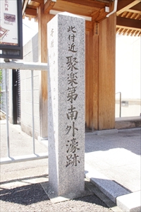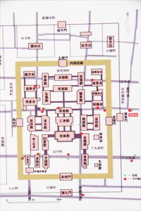 ![]() 「源氏物語ゆかりの地」 ![]() 平安宮復元図、現在地は右端の赤字部分、黄土色の四角部分は内裏内郭回廊、「源氏物語ゆかりの地」の説明板より ![]() ![]() ![]() 「此付近 聚楽第南外濠跡」の石標 |