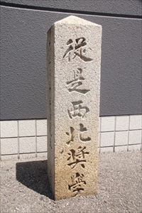 千本三条交差点の北東に、「従是西北奨学院址(これより-せいほく-しょうがくいん-あと)」の石標が立てられている。なお、現在、「院址」の字は地面に埋没している。 平安時代、この地には源氏など王氏の子弟が学んだ奨学院が置かれていた。 ◆歴史年表 平安時代、881年、在原行平は、藤原氏の勧学院に倣い、その西の大学寮南に奨学院を創建した。 900年、9月、奨学院は大学寮南曹になる。「以奨学院為大学寮南曹」と記され、勧学院と並び「南曹の二窓」と称された。(『日本紀略』) 平安時代末期、12世紀(1101-1200)、奨学院は衰える。 現代、1917年、3月、京都市教育会により、現在地のやや南に石標(中京区西ノ京南聖町)が立てられた。 1928年、6月、石標は現在地(中京区西ノ京南聖町)に移され、京都史蹟会が引き継ぐ。 ◆在原行平 平安時代前期の公卿・歌人・教育家・在原行平(ありわら-の-ゆきひら、818-893)。父・第51代・平城天皇の皇子・阿保(あぼ)親王の第2子、業平(なりひら)の兄。826年、兄弟の仲平、業平らと在原姓を賜る。播磨・信濃などの国守、参議、蔵人頭、大宰権帥(だざいのごんのそち)などを経て、中納言、正三位に進む。887年、致仕、881年、藤原氏の勧学院に倣い、一門の子弟教育のために奨学院を設立した。884年以後、3年の間に「在民部卿家歌合」を自邸で主催し、現存最古の歌合せになる。76歳。 和歌に通じ、民部卿を兼ねた。按察使(あぜち)に任じられた。『古今和歌集』『後撰集』に入集している。『古今和歌集』の詞書(ことばがき)に関係し、須磨に蟄居したという。『源氏物語』須磨巻は、行平歌の「わくらばにとふ人あらば須磨の浦に藻塩たれつつわぶと答へよ」(『古今和歌集』巻十八)に因む。また、謡曲『松風』、歌舞伎などの題材になった。 ◆奨学院 奨学院(しょうがくいん)は、平安時代の大学寮の公認寄宿施である大学別曹(べっそう)になる。源氏など王氏の学生(がくしょう)が学んだ。ほかに、和気氏の弘文院、藤原氏の勧学院、橘氏の学館院などがあり修学、仕官の便もはかった。 平安時代前期、881年に、在原行平(ありわら-の-ゆきひら)は、左京三条、大学寮の南、勧学院の西に奨学院を創設する。勧学院に倣ったもので、当初は私設学寮として寄宿しながら学資も支給された。皇親、諸王、賜姓(しせい)源氏、平氏一族の子弟が通い、各氏族の財源により運営されていた。 900年9月に、大学寮の付属施設として公認される。大学寮の南に近接して設けられ、大学寮南曹になった。「以奨学院為大学寮南曹」と記され、勧学院と並び「南曹の二窓」と称された。(『日本紀略』)。勧学院を模範として運営され、別当、学頭などが置かれた。平安時代末期、12世紀(1101-1200)には奨学院は衰える。廃絶したともいう。 奨学院別当職は、村上源中院家(なかのいんけ)が、淳和院別当とともに世襲している。室町幕府3代将軍・足利義満(1358-1408)は、源氏長者として両院別当を兼ねた。以後、室町幕府、江戸両幕府を通じ、歴代将軍が両院別当になる。源氏長者の将軍の世襲として、江戸時代末期まで形式的には別当職の名が続いた。 ❊年号は原則として西暦を、近代以前の月日は旧暦を使用しています。 ❊参考文献・資料 ウェブサイト「京都のいしぶみデータベース-京都市」、『京都大事典』、ウェブサイト「源氏香の図-ROIS-DS人文学オープンデータ共同利用センター」、ウェブサイト「コトバンク」 ![]() ![]() ![]() ![]() ![]() ![]() ![]() ![]() ![]() ![]() |