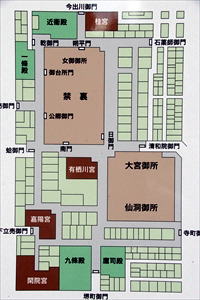 ![]() 駒札 ![]() ![]() 【参照】公家町鷹司邸跡から発掘された陶器類、閑院宮邸跡収納展示館の展示より ![]() 【参照】公家町鷹司邸跡から発掘された江戸時代の文具、閑院宮邸跡収納展示館の展示より ![]() 【参照】公家町鷹司邸跡から発掘された江戸時代中期の菊文小型瓦、閑院宮邸跡収納展示館の展示より ![]() 【参照】江戸時代、慶応年間(1865-1868)の御所周辺、左上に禁裏(茶色部分)、鷹司殿はその下右の緑色部分、環境省京都御苑管理事務所の案内板より |
