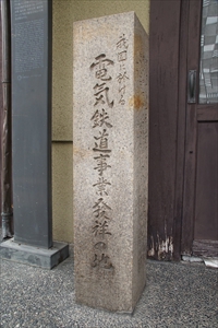 伏見の竹田街道の一角に、「我国に於ける電気鉄道事業発祥の地(わがくに-における-でんき-てつどう-じぎょう-はっしょう-の-ち)」の石標が立てられている。 近代に入り、琵琶湖疏水による水力発電を利用した京都電気鉄道伏見線(京都-伏見)が開業した。この地はその終点だった。 ◆歴史年表 近代、1895年、2月1日、京都電気鉄道株式会社の伏見線が開業する。 現代、1970年、2月1日、鉄道友の会京都支部が石標を立てた。 ◆浜岡光哲 江戸時代後期-近代の実業家・政治家・浜岡光哲(まおか-こうてつ、1853-1936)。幼名は他千代。山城国(京都府)の生まれ。大覚寺坊官・野路家并の3男。従兄弟に実業家・田中源太郎。院承任御経蔵所・浜岡家の養子になる。漢学・ドイツ語を修め、「叡麓学舎」を起こした。1878年、印刷業を始め、1879年、商報会社を設立し「京都商事迅報」を刊行した。1880年/1881年、京都府会創設とともに議員当選する。1881年、「京都新報(後の「中外電報」)」を刊行する。1882年、京都商工会議所(1891年に京都商業会議所に名称変更)を設立した。1885年、「日出新聞」を創刊する。1890年、帝国議会開設とともに衆院議員に当選し、以後3期務めた。1894年、京都電気鉄道社長に就任した。1901年、関西貿易合資会社が破綻する。1911年-1926年、京都商業会議所会頭に就いた。 京都商工銀行、京都株式取引所、京都陶器、京都織物などを創立した。京都火災保険会社社長ほか、複数の事業会社重役になった。83歳。 ◆大沢善助 江戸時代後期-近代の実業家・大沢善助(おおさわ-ぜんすけ、1854-1934)。清八。俠客・大垣屋音松の次男。17歳で、父の大親分・大沢清八(京都諸官家の人入家業大元締)の養子になる。1871年、家を出て白米商、魚商、瀬戸物商、古道具商などに従事した。押絵製造、金庫・衡器類の輸入販売で成功する。1882年、京都商工会議所の設立発起人の一人になる。1884年頃より、市・府会議員、府会議長になり、琵琶湖疏水事業工事監督も務めた。1890年、時計・自転車の輸入・製造・販売を始める。1891年、琵琶湖疏水による水力発電電力を用い、京都に時計工場を設立する。大沢商会を創立し、時計・自転車・雑貨などを販売した。1892年-1927年、京都電燈会社の3代目社長に就任し、日本初の遠距離送電に成功している。 釜山電燈、日本水力、大同電力、京都陶器、京都商工銀行の各重役、京都商工会議所副会頭も務めた。得意先の同志社寄宿舎に通い、新島襄に感化されキリスト教に入信した。80歳。 墓は神楽岡(左京区)にある。 ◆高木文平 江戸時代後期-近代の実業家・教育者・高木文平(たかぎ-ぶんぺい、1843-1910)。丹波桑田郡(京都府)の生まれ。代官の長男。弟に司法官・弁護士・高木豊三。1868年以降、田園開発し、生地に茶・桑栽培を導入した。1869年、私学校を設立し、考案した兵式体操を全国に普及させる。1875年、京都府監察になる。1879年、京都名品会社を設立する。1880年-1890年、府会議員になる。1882年、京都商工会議所の初代会長に就いた。1889年-1890年、市会議員になる。1894年、京都電気鉄道会社の社長、1906年、宇治電気会社取締役に就任した。68歳。 琵琶湖疏水計画に発電事業を加えた。京都経済界で指導的な立場にあった。 ◆京都電気鉄道 近代、1894年に、日本最初の営業電気鉄道である京都電気鉄道株式会社(京電)が、資本金30万円で設立された。浜岡光哲、大沢善助らが関わり、初代社長に高木文平が就いた。本社は当初、二条室町にあり、後に木屋町四条に移転している。 1895年2月1日に、伏見線が仮営業を始めた。京都市下京区東洞院通東塩小路高倉踏切(旧東海道線)南側を起点とした。この地、伏見下油掛町は終点であり、区間6.5kmの狭軌道だった。日本初の市街電車であり、電力は琵琶湖疏水による水力発電の電力を利用した。「チンチン電車」と呼ばれ親しまれ、運転手、車掌、告知人が乗車していた。告知人は雑踏、夜間などで電車前で交通整理をした。1904年には告知人は廃止されている。1914年には中書島まで路線延伸している。 1896年4月以降に路線拡張された。幹線は国鉄京都駅付近を起点とし、東は木屋町通、西は西洞院-堀川通から北上し、堀川下立売で合流し北野線に至った。 ほかに鴨東線(二条木屋町-三条蹴上)、出町線(寺町丸太町-出町)、御池線(堀川御池-二条停車場・二条駅)、稲荷線(伏見線・勧進橋-稲荷)、淀川線(貨物専用)などが開通した。 1912年に京都市営電気軌道事業が開通し路線が競合した。1918年に京都府知事の裁定により、京都電気鉄道の会社事業は京都市に移譲され会社は解散した。その後、1926年までに大部分の路線は廃止されている。1961年7月に、最後まで残されていた北野線(北野-京都駅)が廃止された。 ◆石標 1970年2月1日に、「我国に於ける電気鉄道事業発祥の地」の石標が鉄道友の会京都支部により立てられた。 同様の趣旨の碑が、起点になる京都駅(下京区)近くにもある。 ❊年号は原則として西暦を、近代以前の月日は旧暦を使用しています。 ❊参考文献