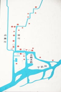 ![]() 角倉了以水利紀功碑 ![]() 角倉了以水利紀功碑 ![]() 角倉了以水利紀功碑 ![]() 副碑 ![]() 説明版 ![]() 江戸時代の高瀬川(左上)、濠川(その右)、現在地は2川の合流点付近、説明版より ![]() 濠川 ![]() |