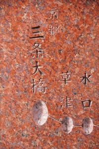 三条大橋の東詰北側に「駅伝の碑(えきでん-の-ひ)が立つ。 駅伝競走は近代に日本で始まった。この地は発祥の地になり出発点だった。 ◆歴史年表 近代、1917年、4月27日-29日の3日間、「東京奠都(てんと、建都)五十周年記念大博覧会」に際し、「東京奠都記念・東海道五十三次駅伝徒歩競走」(京都・三条大橋-東京・上野不忍池)が開催された。日本初の駅伝競争になった。 現代、 2002年、4月、「駅伝の碑」が、公益財団法人日本陸上競技連盟などにより立てられた。 2017年、4月、「駅伝 発祥の地」の碑が、「駅伝発祥百年記念」として、公益財団法人日本陸上競技連盟・一般財団法人京都陸上競技連盟などにより立てられた。 ◆土岐善麿 近現代の歌人・国語学者・土岐善麿(とき-ぜんまろ、1885-1980)。号は哀果。東京の生れ。等光寺の善静の二男。東京府立第一中学校(現・東京都立日比谷高等学校)を経て、1905年、金子薫園の「白菊会」に入会した。早稲田大学英文科に進学し、島村抱月に師事する。馬場孤蝶に学び、同級・若山牧水と作歌した。大学卒業後、1910年、読売新聞社会部記者になる。ローマ字綴りの一首三行書き第一歌集『NAKIWARAI』を出版し、石川啄木に影響を与え、親交した。田中舘愛橘らと『ローマ字世界』の編集に当たる。1911年、大杉栄、荒畑寒村らと『近代思想』の執筆者に加わる。1913年、読売新聞特派員として満州、朝鮮を視察する。レフ・トルストイの短編集『隠遁』を翻訳した。雑誌『生活と藝術』(1915年発禁処分、1916年廃刊)を創刊し、啄木の遺稿などを発表する。1917年、「東京奠都五十周年記念大博覧会」の協賛事業として「東海道五十三次駅伝徒歩競走」を中心になり企画した。大日本体育協会(現・日本スポーツ協会)副会長・武田千代三郎とともに「駅伝競走」と名付けたという。1918年-1940年、朝日新聞に移る。1923年、東京朝日新聞学芸部長に就任した。1924年、北原白秋らと雑誌『日光』の創刊に参加する。1928年、日本エスペラント学会理事、1929年、斉藤茂吉らと朝日新聞社主催の飛行機搭乗歌会に参加する。1934年、日本放送協会の放送用語並発音改善調査委員に就く。1936年、「大日本歌人協会」常任理事に就任した。1940年、朝日新聞を退社し、歌人協会議長として解散を決議した。1946年、新憲法施行記念国民歌『われらの日本』の作詞する。1947年、学士院賞を受賞した。1947年、早稲田大学教授になる。1949年、国語審議会会長に就任した。1955年、日本芸術院会員に選ばれ、紫綬褒章を受章する。1965年、武蔵野女子大学文学部日本文学科主任教授に就任した。1967年、芸術祭賞を受賞する。1977年、仏教伝道文化賞・功労賞を受賞した。94歳。 生活派歌人の育成に努めた。現代国語・国字、新字・新仮名導入にも関わる。 ◆武田千代三郎 近代の官僚・教育家・スポーツ指導者・武田千代三郎(たけだ-ちよさぶろう、1867-1932)。筑後国(福岡県)の生まれ。柳河藩士・武田道夫の2男。共立学校、第一高等学校を経て、東京帝国大学法科大学法律学科に入学した。F.W.ストレンジの学生スポーツ論に傾倒する。1889年、大学卒業後、法制局雇になる。徴兵され近衛歩兵第1連隊に入隊した。1890年、陸軍歩兵二等軍曹で満期除隊後、法制局試補、法制局参事官を務める。1893年、内務省に転じ、広島県参事官に就任した。以後、長野県警部長、群馬県書記官、兵庫県書記官などを歴任する。1899年、秋田県知事、1902年、山口県知事になる。1903年、山口県知事を休職する。1905年、山梨県知事になった。1908年、青森県知事に転じ、1913年、休職、退官した。1913年-1918年、神宮皇学館長、1913年-1922年、大日本体育協会副会長に就任した。1917年、「東京奠都五十周年記念大博覧会」の協賛事業として、「東海道五十三次駅伝徒歩競走」を読売新聞社会部記者・土岐善麿とともに「駅伝競走」と名付けたという。1918年、市立大阪高等商業学校長事務取扱に就任し、同校長を務める。1928年まで、改組した旧制大阪商科大学・同高等商業部の学長事務取扱として在任した。著『理論実験競技運動』『運動競士協会憲章類纂』。65歳。 ◆日比野寛 近現代の教育者・日比野寛(ひびの-かん/ゆたか/ひろし、1866-1950)。旧姓は織田。織田文斎の3男。尾張国(愛知県)の生まれ。1885年、愛知県第一中学校(現・旭丘高校)から第一高等学校(現・東京大学)に進学した。在学中に胃腸病を患い、以後健康のため「歩き方・姿勢」を改め健康回復した。1898年、日比野家の養子に入る。東京帝国大学法科卒後、農商務省鉱山監督官に入る。1899年、母校の一中の11代校長として着任した。1911年、 日本初の生徒長距離競走を実施した。1917年、衆院議員(憲政会)になる。「東京奠都五十周年記念大博覧会」の協賛事業として、「東海道五十三次駅伝徒歩競走」の最終走者になった。83歳。 スポーツを奨励し、日比野式走法(上体は真直ぐ腰上、運動は手と足でする)の普及に務めた。日本初でマラソンを本格的に教育界に導入し、後に「マラソン王」と呼ばれた