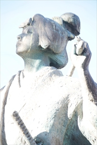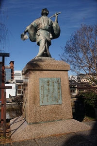 四条大橋東詰北側に「出雲の阿国像(いずも/いづも-の-おくに-ぞう)」が立つ。 阿国は歌舞伎踊、阿国歌舞伎の創始者とされる。阿国と四条河原周辺の関連はなかったとみられている。 ◆歴史年表 詳細は不明。 安土・桃山時代、1591年、5月、「ややこおどり」が北野天満宮の松梅院で披露された。(『北野社家日記』) 1600年、京都で公家に招かれ近江殿、宮中で菊とともに演じたという。(『時慶卿記』) 1603年、男装した阿国は北野天満宮境内で「歌舞伎踊(阿国歌舞伎)」を披露した。(『当代記』) 現代、1953年、南座の西側に「阿国歌舞伎発祥地の石碑」が松竹により立てられた。 1994年、11月、「出雲の阿国像」は「歌舞伎発祥400年」記念として、現在地に京都洛中ライオンズクラブにより立てられた。 ◆出雲阿国 安土・桃山時代-江戸時代前期の芸能者・出雲阿国(いずも/いづも-の-おくに、1572?-? )。詳細は不明。於国、国、クニ。出雲国杵築中村の里・鍛冶・中村三右衛門の娘/洛北出雲路河原の時宗鉦打聖の娘/奈良近郊の散所の「歩き巫女(みこ)」ともいう。出雲大社の巫女(アルキ神子[みこ]、歩き巫女)になり、永禄年間(1558-1570)、出雲大社勧進のために神楽舞で諸国を巡ったともいう。美貌もあり評判になる。1582年、奈良・春日大社で上演された「ややこ(稚児)踊り」は、8歳の加賀と演じたともいう。1591年、ややこおどりが北野天満宮の松梅院で披露された。文禄年間(1593-1596)、伏水(ふしみ)城で結城/松平秀康の前で踊ったともいう。慶長年間(1596-1615)、京都に上り歌舞伎踊りを始めたという。1600年、京都で公家に招かれ近江殿、宮中で菊とともに演じたという。(『時慶卿記』)。1603年、春、北野神社の東で南蛮風の衣装に男装した阿国の「歌舞伎踊(阿国歌舞伎)」が披露される。五条の東の橋詰、三条縄手の東、祇園の町のうしろに舞台を建てたともいう。1604年、伊勢国桑名、1607年、江戸城で興行したともいう。その後の消息は不明とされる。晩年、故郷で出家し智月尼と称したともいう。 歌舞伎踊、阿国歌舞伎の創始者とされる。 ◆阿国・歌舞伎 四条河原は、南北朝時代以来の市民の歓楽地だった。勧進田楽、猿楽を行う市民の遊散所でもあった。当時の鴨川の東岸は、現在の大和大路まで、西岸は現在の河原町辺りまであった。一帯は広大な広場であり、芝居小屋なども建ち並ぶ遊興地だった。 近世の初め、戦乱の犠牲者を祀る御霊会に伴い風流踊(念仏踊)が流行した。この風流踊に仮面を付けず振りをそろえた舞踏劇が流行る。 安土・桃山時代、1582年に、10歳の出雲阿国は、奈良春日若宮で「ややこ踊」という少女踊を舞う。1600年には、京都の近衛殿、宮中で「クニ」「菊」が雲州(出雲国)のややこ踊を演じたという。(『時慶卿記』)。 1603年に、阿国は北野神社境内を拠点として、男装帯刀し「歌舞伎踊(阿国歌舞伎)」を披露した。当時の若者「かぶき者」が茶屋女(遊郭)に通う姿に扮し、念仏踊と滑稽寸劇を演じて人気を博した。その後、四条祇園社の近くでも興行する。 四条河原での阿国による興行はなかったといわれている。四条河原町の小屋掛けで演じられたのは、阿国の踊りを真似た六条柳町(六条三筋町)の遊女による総踊、遊女歌舞伎だったという 阿国、名古屋山三(名護屋山三郎)らは、歌舞伎(傾奇が語源)の創始者とされている。阿国は派手な衣装をまとい、黄金の太刀に、首には十字架を掛けていた。阿国は若衆に扮し、女装した若者相手に、恋のさまを踊るという趣向だった。当時の世相、風俗、事件なども踊りに折り込み、都人の「天下一の女」との評判を取る。三味線はまだなく、囃子方には笛、太鼓、鼓があり、猿若という道化役者が加わっていた。 阿国は、五条大橋(いまの松原橋付近)の河原で小屋掛けしたともいう。以後、多くの追従者による遊女歌舞伎、女歌舞伎が生まれる。その後、豊臣秀吉は、伏見城への通行の邪魔になるとして、大村梅庵により四条河原に移させたともいう。1604年に阿国は京都を去り、地方巡業を続けたという。1607年には江戸城に招かれて踊ったともいう。 ◆阿国像 ◈四条大橋東詰北に「阿国像」がある。1994年11月に「歌舞伎発祥400年」記念として、京都洛中ライオンズクラブにより立てられた。刀脇差、ロザリオの傾き姿になっている。 「かぶき踊の祖 出雲の阿国 都に来たりて その踊を披露し 都人を酔わせる」の碑文が刻まれている。「此比、かぶき踊りと云事有、是は出雲国神子女名は国、但非好女、仕出、京都へ上る、縦(たとえ)ハ異風なる男のまねをして、刀脇指衣装以下殊異相、彼男茶屋女と戯る体有難くしたり、京中の上下賞翫(しょうがん)する事不斜、伏見城江へも参上し、度々踊る、その後学之、かぶきの座いくらも有て諸国へ下る、但江戸右大将秀忠公は終不見給」(『当代記』) ◈「阿国歌舞伎発祥乃地」の碑は、四条大橋東側、南座の西入り口にある。1953年に松竹により建立された。鞍馬石。 ❊年号は原則として西暦を、近代以前の月日は旧暦