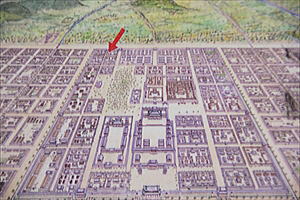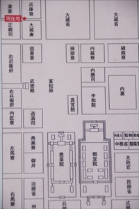 ![]() 京都市考古学資料館の説明板 ![]() 現在地は赤字部分、左下に正親司、説明板より ![]() 赤い矢印部分が現在地、中央下に朝堂院、説明板より |