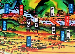 ![]() 旧清滝川駅(左)、清滝川、京都愛宕研究会の説明板より