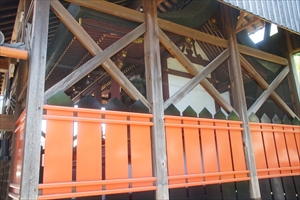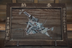 ⋄「造営上葺棟上」は、室町時代後期、1550年5月記による。1549年10月に下遷宮が行われている。全長58.5㎝、側長51㎝、幅14㎝、厚さ1.1㎝、杉材。