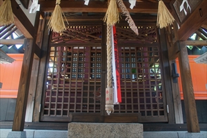 室町時代の用材を多く残し知られている。小規模の三間社流造の建築物で、向拝の打越垂木(母屋から向拝の柱の上方に架け渡した垂木)などは面取りし、かなりの反りがある。三斗の組物も大面取りになる。向拝の中間の蟇股(かえるまた)は質素ながら、笹竜胆(ささりんどう)の意匠になっている。