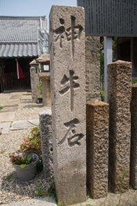久御山町佐山の曹洞宗・大松寺(だいしょう-じ)山門脇に神牛石神社(じんぎゅうせき-じんじゃ)がある。神牛石社とも呼ばれている。 御神体は、神牛石という黒い霊石を祀る。石は世に何か異変の起こる前に、しっとりと濡れて予言するという。 ◆歴史年表 創建、変遷の詳細は不明。 平安時代、1053年、仁海の感得により神牛石は出現したという。 鎌倉時代、1243年、興正菩薩叡尊により堂宇が建てられた。また、叡尊は三福寺(山福寺)にこの石を安置したという。 その後、石は椏本(あてもと)八幡宮(雙栗[さぐり]神社)の神宮寺・三福寺の蓮池に沈んだという。 安土・桃山時代、天正年間(1573-1592)、中良元が夢告により池中より石を掘り出して祀ったという。 江戸時代、1676年、石について記されている。(『椏本八幡宮縁起』) 1742年、8月23日、三福寺境内の蓮池跡から石を見つけて堀出し、この日を例祭日にしたという。 1802年、神牛石について記されている。(「記録古書改」) 1812年、石について記されている。(『神牛石縁起』) 近代、1868年、三福寺は廃寺になり、石を御神体にする神牛石神社が創建された。 ◆仁海 平安時代後期の僧・仁海(にんがい、?-?)。詳細不明。1053年、久御山佐山に浄福寺(浄安寺の前身)を創建した。 ◆叡尊 鎌倉時代前期-後期の律宗の僧・叡尊(えいそん/えいぞん、1201-1290)。男性。睿尊、字は思円、諡号は興正菩薩(こうしようぼさつ) 。大和国(奈良県)の生まれ。父・興福寺の学侶・慶玄、母・藤原氏。1207年、母を亡くし、醍醐寺門前の家の養子になり、醍醐寺に入り真言を学ぶ。1217年、叡賢を師として出家した。1234年、戒律の復興を志す。1235年、円晴(えんせい)が東大寺で『四分律行事鈔』講じたのを聞く。大和国西大寺に移る。1236年、東大寺で円晴、覚盛(かくじょう)、有厳らと自誓受戒し比丘になる。その後、大和・海竜王寺に移る。1238年、西大寺に住み、再興した。1262年、鎌倉幕府の北条時頼・実時に招かれて鎌倉に下り、北条一族・御家人などに授戒した。1269年、般若寺で非人供養する。1281年、蒙古来襲時に、伊勢神宮・石清水八幡宮で異国降伏の祈祷も行う。1285年、叡尊の申請による網代破却が行われた。1286年、宇治川の網代破却による殺生禁断を実行し、勧進により宇治橋、浮島の十三石塔を再興した。著『梵網古迹文集』 (10巻) 、自叙伝『感身学正(かんじょうがくしょう)記』 (3巻) など。90歳。 西大寺の中興開山。戒律の復興に努め、律宗中興の祖になる。後嵯峨上皇(第88代)・後深草3上皇(第89代)・亀山上皇(第90代)の帰依を受けた。殺生禁断・慈善救済・土木事業などを行い、非人・貧民・病人救済を行った。 ◆神牛石 神牛石についていくつかの伝承がある。 平安時代後期、1053年に、仁海(?-?)の感得により神牛石は出現したという。鎌倉時代中期、1243年に、興正菩薩叡尊(1201-1290)により堂宇が建てられた。また、叡尊は三福寺(山福寺)に石を安置したともいう。寺は、椏本(あてもと)八幡宮(雙栗[さぐり]神社)の神宮寺だった。 また、その後、三福寺の蓮池に石は沈んだという。安土・桃山時代、天正年間(1573-1592)に、中良元という人が夢告に従い、池中より石を掘り出して祀ったともいう。 江戸時代前期、1676年に石について記されている。昔より三福寺の門内に大石があり、神牛石と呼ばれていた。(『椏本八幡宮縁起』) また、江戸時代中期、1741年8月24日八ツ時に石は出現し、前日九ツ時には塔石が出たという。(「記録古書改」、1802)。『山州名跡志』(1711)、『山城名勝志』(1711)にも記されている。 その後、石の所在は不明になった。江戸時代中期、1742年8月23日に、三福寺境内の蓮池跡から石を見つけて堀り出した。以来、この日を例祭日にしたともいう。(『神牛石縁起』、1812) 近代、1868年に三福寺は廃寺になる。石を御神体に神牛石神社が創建された。 神牛石は色黒く、形は牛の様な形をしていた。天下に騒ぎ(凶事)があると、必ず石から(水が)滴り落ちて汗のようだったという。神異をあらわす奇石だったという。(『椏本八幡宮縁起』) 以来、石は牛の守護神として崇敬されてきた。なお、神牛石には3種あり、上野国(群馬県)の赤石、近江国(滋賀県)琵琶湖底にあるという白石、神牛石神社の黒石だったという。神牛石は普段は開帳されていない。 ◆文化財 「十三重石塔」は、神牛石神社の右に立つ。鎌倉時代に興正菩薩叡尊が建立したという。三福寺の荒廃後に散乱し、その後、現在地に復元したという。 初重軸部に金剛界四仏の梵字を刻んでいる。高さ3m、花崗岩製。 ◆祭礼 かつて、春秋の例祭(3月23日・9月23日)は、牛を飼育している農家による神牛講が司っていた。 近代、昭和期(1926-1989)初期の例祭日には、近郊・河内からも牛馬が集められた。境内では品評会なども催され、露店も出て賑わっていたという。現代、昭和30年代(1955-1964)に入り、農耕の機械化により牛馬使役は廃れ講も解散した。 現在は、祭祀(9月23日)が大松寺により執り行われている。 ◆年間行事 例祭(9月23