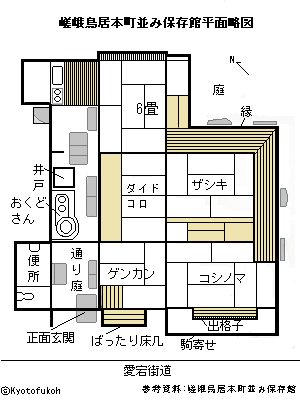 嵯峨鳥居本町(さが-とりいもと-ちょう)の愛宕街道沿いに、嵯峨鳥居本町並み保存館(さがとりいもと-まちなみ-ほぞんかん)が建てられている。 近代に入り建てられた「むしこ造町家」になる。 ◆歴史年表 近代、明治期(1868-1912)初期、町家(現・嵯峨鳥居本町並み保存館)は建てられた。 現代、1979年、2月22日、京都市は嵯峨鳥居本町(延長650m、2.6ha)を、京都の「伝統的建造物群保存地区」の1つとして選定した。5月21日、同地区は、全国伝統的建造物群保存地区協議会により「全国伝統的建造物群保存地区」に選ばれた。 1993年、11月、嵯峨鳥居本町並み保存館を京都市が開設している。 2006年、愛宕街道は国土交通省により、京都市内で唯一の「日本風景街道」に選定される。 ◆保存館 「嵯峨鳥居本町並み保存館」は、現代、1993年11月に京都市により開設された。近代、明治期(1868-1912)初期に建てられた「むしこ造町家」になる。現在は復元的に整備されている。民間の伝統的建造物・土地を借り受け、文化庁・日本芸術振興会の助成を受けて修復整備された。 むしこ造町家は、愛宕街道沿いの下地区(五体地蔵から化野念仏寺付近)に見られる。表構えは広い正面玄関、通り庇、細かい平格子・出格子、ばったり床几(しょうぎ)、駒寄(こまよ)せを特徴にしている。2階には白い漆喰壁・土塗りの漆喰壁・虫籠窓(むしこまど)、瓦葺屋根の大きな煙出しなどが見られる。洛中の町家と比較し、間口は広く、庇は深い。 内部は、北西から南東に走る通り庭(ニワ)に面し、各部屋が配置されている。入口右手にゲンカン(4畳、板間)、その奥(東)にコシノマ(6畳)、その北にザシキ(6畳、床・棚など)、その西にダイドコロ(4畳・板張)、その北に6畳間がある。ザシキの東側・北側に縁を廻し、外庭に接している。ダイドコロの西の通り庭には、土間におくどさん(竃)・大きな井戸が復元されている。天井には火袋・煙出しがある。建具は舞良戸(板戸)に復元されている。 なお、京都市の「伝統的建造物群保存地区」内における助成対象のむしこ造町家としては次のように定められている。住居様式:木造真壁造、中2階建平入形式、屋根・庇:日本瓦葺・切妻、軒裏は垂木・野地板を見せる。 壁面:しっくい塗/京壁、腰は羽目板よろい張、1階は出格子・平格子・引込格子戸、2階はむしこ窓。材料:柱は桧/これに準ずる材、木部の見掛りは上小節以上。色彩:木部は生地仕上げ/べんがら塗。 むしこ造店舗様式の壁面:同上で1階は腰高障子戸/格子戸・戸袋。 ◆町家の特徴 嵯峨鳥居本町並み保存館に見られる、主な町家造の特徴として次のようなものがある。 ◈「平格子(ひらこうし)」は、柱間に納められる木製格子になる。「出格子(でこうし)」は、建物本体から30-45㎝ほど外側に柱を立て格子で囲んだ部分をいう。いずれも、外からの侵入を防ぎ、外からは室中を覗きにくい。形状には様々なものがある。 ◈「通り庇(とおりひさし)」は、建物の表に面する通りに向かって伸びる庇をいう。庇の下はばったり床几かせ設置されている。通り道でもあり、公私の共有的な空間になっている。 ◈「駒寄せ(こまよせ)」は、表構えの正面に設けた木製柵になる。通り・敷地の境界の役割がある。往来者が軒下に入り込むのを防ぎ、泥はね・埃から建物を守る。本来は牛馬を繋ぐためだったともいう。 ◈「ばったり床几(しょうぎ)」は、見世棚、揚げ見世とも呼ばれた。軒先の壁に寄せた折り畳み式の木製床几で、腰掛用・商品などの陳列台・作業台など多目的に用いられた。 ◈「虫籠窓(むしこまど)は、厨子(ずし)という中2階正面に設けられた。土で塗り固めた格子状の窓をいう。江戸時代に防火対策として用いられたとも、通風・採光・防火・防犯のためともいう。往来者を見下ろさないための工夫ともいう。内側には障子戸が付く。夏場に障子を開け、中2階・屋根裏に籠った熱を抜く。様々な意匠がある。 ◈「通り庭(とおりにわ)」は、表から奥へと続く細長い土間をいう。土足で人が通る空間であり、風通し・採光の役割も担った。上部は火袋(ひぶくろ)という吹き抜けになっていた。食事の準備のによる熱気・煙を逃し、防火への配慮もあった。 通り庭には、井戸・はしり(長し台)、おくどさん・水屋(物入れ)などが一列に配してあった。 ◈「煙出し(けむりだし)」は、竈の上部にあり、屋根の棟部分に開口部を設け、その上に小さな屋根を載せている。。竈などで炊事をした煙を屋外に排し、採光の意味もあった。 ◈「おくどさん/くど」は、関西地方の竈(かまど)の愛称で、粘土・石で周囲を囲い、仕上げは漆喰による。風を除け火の粉が散るのを防ぎ、効率よく煮炊きができるように工夫されていた。火伏神の愛宕神社「阿多古祀符 火迺要慎」の札が貼られている。 大釜は「おかまさん」といわれ、平素は使わず、松・榊の枝を飾り竈の神を祀った。ハレの正月前の餅つき・煮豆の時などの儀式時に使用された。大釜の蓋は厚板3枚を2本の吸付蟻桟(すいつき-あり