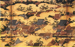 靭屋町(うつぼや-ちょう)の小川なかよし広場に、「戦国時代上京の結集点・革堂(行願寺)」の説明板が立てられている。 安土・桃山時代までは、この地に革堂(こうどう、行願寺)・誓願寺・百万遍(知恩寺)という3大寺院の伽藍が建ち並んでいた。 ◆歴史年表 平安時代、1004年/1005年、革堂(行願寺)は第66代・一条天皇の勅願により、一条小川に建立されたという。(『百錬抄』『日本紀略』) 南北朝時代、1382年、知恩寺(知恩寺)は一条通小川(一条通油小路北、現在の上京区元百万遍町付近)に移転した。 鎌倉時代、誓願寺は一条通小川(現・上京区元誓願寺通小川西入ル)に移転している。 安土・桃山時代、1590年/天正年間(1573-1592)、革堂は豊臣秀吉の都市改造にともない、現在の寺町荒神口に移転する。 1590年/1591年、知恩寺は秀吉により、現在の梨木神社付近(京極土御門、現・上京区寺町荒神口北)に移された。(『州名跡志略』) 1591年、誓願寺は秀吉により現在地(三条寺町)に寺地が移された。(『晴豊公記』) ◆革堂などの跡 かつて小川通には小川(こかわ)があり、南流していた。現在の小川なかよし広場は、この川を埋め立てた位置に当る。 室町時代には、小川通西側に面し北小路(今出川通)から一条通の間に北から誓願寺・革堂(こうどう、行願寺)・百万遍(知恩寺)という3寺院が建てられていた。 革堂は上京の集会所として町堂として利用され、有事には早鐘が打ち鳴らされ、住民の寄り合う上京の自治集結点として機能した。 室町時代前期には、京中に10数軒の湯屋が営業していた。革堂にもあり、「一条風呂」「革堂風呂」とも呼ばれた。風呂は名高く、庶民のみならず公卿・山科言継(1507-1579)も度々利用した。『洛中洛外図屏風 上杉本』にも、小川に沿う小川通りに面し、誓願寺・革堂・その本堂やや下に風呂・百万遍が描かれている。風呂には下帯姿で入浴する人、湯女、通りの往来者、井戸・はねつるべなども描かれている。 安土・桃山時代、1590年-1591年に3寺院は移転した。 ◆革堂町 周辺には革堂町・革堂図子・元百万遍町・元誓願寺通など関連する地名が残る。 革堂町の地名由来は革堂(行願寺)に因んでいる。革堂は、平安時代後期、1004年/1005年に第66代・一条天皇の勅願により、一条小川に建立されたという。(『百錬抄』『日本紀略』)。安土・桃山時代、1590年/天正年間(1573-1592)には、豊臣秀吉の都市改造にともない、現在地の寺町荒神口に移転する。 革堂町については、「カウダウ」(『京師内外地図」)、革堂(「中昔京師地図」)、西革堂町(「洛中地図」1637)、「かゝ殿丁」(「平安城町並図」)、「みずの屋加賀殿町」(『京雀』1665)、「かう堂町」(「洛中洛外之絵図」、寛文年間[1661-1673]後期)、「革堂之町」(『京町鑑』、1762)などと記されている。 ❊年号は原則として西暦を、近代以前の月日は旧暦を使用しています。 ❊参考文献・資料 東陣プロジェクト実行委員会の説明板(上京区役所・京都市考古資料館)、『京都市の地名』、ウェブサイト「コトバンク」 ![]() ![]() ![]() ![]() ![]() ![]() ![]() ![]() |