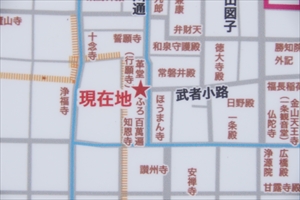 ![]() 東陣プロジェクト実行委員会の説明板 ![]() 革堂町の地名 ![]() 元百万遍町の地名 ![]() 「元誓願寺通」の通り名 ![]() 現在地(星印)、すぐ北に革堂、南に「ふろ」、革堂の北に誓願寺、ふろの南に知恩寺、説明板より ![]() 小川(黒い線)、中央に革堂、その左下に風呂、右端に誓願寺、左端に知恩寺、「上杉本洛中洛外図屏風」、東陣プロジェクト実行委員会の説明板より ![]() |
