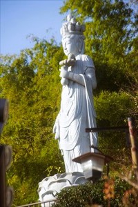西賀茂鎮守菴町(ちんじゅあん-ちょう)の高台に、法雲寺(ほううん-じ)はある。山号は日照山という。 浄土宗西山深草派、誓願寺末になる。洛陽地蔵菩薩霊場48カ所の第29番霊場になる。 ◆歴史年表 安土・桃山時代、1591年、豊臣秀吉の母・大政所が帰依した長翁玉春により秀吉に請願し開かれる。当初は聚楽第近郊の四条大宮の地にあった。 江戸時代、1788年、堂宇が焼失する。 近代、1901年、27世・蒼空の時、本堂は東本願寺の勅使御門建立の余材により完成した。 現代、1983年、現在地の西賀茂に移転する。 1994年、信徒会館が竣工する。 ◆長翁玉春 安土・桃山時代の浄土宗の僧・長翁玉春(?-?)。詳細不明。男性。1591年、豊臣秀吉の母・大政所が帰依し、四条大宮に法雲寺を開いた。 ◆仏像など ◈本堂に「阿弥陀三尊立像」を安置している。 ◈地蔵堂に「河原地蔵」を祀る。洛陽地蔵菩薩霊場48カ所の第29番霊場西院になる。 ◈「子養育地蔵尊」がある。 ◆観音像 露仏の「十一面観音菩薩石像」(高さ10m)は、一刀彫りの石像としては日本一の高さを誇る。 ◆眺望 本堂正面から東に比叡山・東山三十六峰などを望める。 ❊年号は原則として西暦を、近代以前の月日は旧暦を使用しています。 ❊参考文献・資料 ウェブサイト「法雲寺」、駒札 ![]() ![]() ![]() ![]() ![]() |