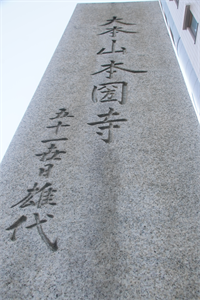 堀川通五条上ルに「大本山本圀寺(だいほんざん-ほんこく-じ)」と刻まれた巨大な題目塔が立てられている。かつてこの付近一帯には、本圀寺があった。「西の祖山(そざん)」「西の総本」ともいわれ、山号は大光山という。現在は山科に移っている。 傍らに「朝鮮通信使ゆかりの地」の駒札が立てられている。江戸時代には、李氏朝鮮が派遣した朝鮮通信使の宿所になっていた。 日蓮宗の大本山(霊蹟寺院)。本尊は大曼荼羅。洛中法華21ヶ本山。日蓮宗京都16本山の一つ。日蓮宗四大本山の一つ。 ◆歴史年表 鎌倉時代、1253年、日蓮(1222-1282)が、鎌倉松葉ヶ谷(まつばがやつ)に法華堂(本勝寺)を建立したのを前身にする。(寺伝) 1261年、日蓮の伊豆法難により、寺は破却されている。 1263年、再興され、「大光無量山本国土妙寺」に改め、日蓮の布教伝道の根本道場になる。 1271年、再び破却された。日蓮は佐渡に配流された。 1307年、再建され、将軍家の祈願所になる。第96代・後醍醐天皇(在位:1318-1339)の勅願所になる。 鎌倉時代末期、右大臣・今出川兼季(菊亭兼季)の菩提所になる。 南北朝時代、1345年、4世・日静の時、北朝第2代・光明天皇の勅により、京都六条に永代寺領を贈られ鎌倉松葉ヶ谷・法華堂より移る。「本国(國)寺」と改称した。寺域は広大で、東西2町・南北6町(堀川小路西、六条坊門小路南、大宮大路東、七条大路北の12町とも)にわたる。御所の坤(裏鬼門)の方角に配置され、皇室鎮護の霊場になった。 足利尊氏(1305-1358)との俗縁により公武の外護を得た。 1381年頃、四条門流の妙顕寺とともに、京中で四条門流として日蓮宗を代表する寺になる。 1397年、日陣は上洛後、本国寺の日静(にちじょう)に師事する。 室町時代、1536年、旧7月22日-28日、南近江の守護六角氏らが、京都の法華宗二十一本山を焼討ちした天文法華の乱では、法華一揆の拠点寺になり最後まで奮戦した。だが、焼失し、堺・成就寺に避難する。 1542年、勅許により帰洛の許可が下り、再建に着手する。 1547年、京都六条に再建され、本尊遷座された。 1565年、徳川光圀が母の追善供養を行う。 1568年、織田信長の再上洛にともない、本国寺は室町幕府15代将軍・足利義昭の仮居所(六条御所)になる。 1569年、 室町幕府第15代将軍・足利義昭の仮の御所(六条御所)、仮幕府の置かれた本国寺を、三好三人衆が急襲した。明智光秀は防戦する。信長は岐阜より軍を率いて京都に戻り鎮圧する。(「本国寺の変(六条合戦)」)。変後、織田信長は二条御所(二条城)を築城し、部材の一部は移された。義昭は御所に移した。 室町時代末、寺の周囲に環濠が築かれ、寺内町が形成された。 安土・桃山時代、1582年、豊臣秀吉は上洛の際の宿所にあてる。市中掌握と山崎城の築城を急ぐ。この頃、日蓮宗六条門流の大本山だった。 1591年、本願寺造立のため、南二町の寺領を割譲される。 江戸時代初期、「本国寺」と記されていた。 江戸時代、徳川家、豊臣秀吉の姉・日秀尼(1534-1625)、加藤清正(1562-1611)らの庇護を受け伽藍を拡充した。 1633年、末寺269を数えた。(「京都本国寺末寺帳」) 1636年、入洛した朝鮮通信使の400人の随員の定宿地になる。以来、ほぼすべて当寺を宿舎として京都に滞在した。 1637年、朝鮮通信使が江戸からの帰りに立ち寄る。石川丈山が訪れ、一行の書記・権 侙(クオン・チョク)と筆談・詩文の応酬を行う。 1643年、朝鮮通信使が定宿する。 1655年、朝鮮通信使が定宿した。 1656年、瑤林院の生母・清浄院が京都で逝去し、本国寺の清正廟の隣に埋葬した。自らの逆修墓を建立する。 1682年、朝鮮通信使が定宿した。相国寺の別宗祖縁(べっしゅう-そえん)は、随員と筆談唱和した。 1685年、 水戸藩主・徳川光圀が篤く当寺に帰依外護したとして、「圀」の一字を下され、寺号を「本圀寺」に改めたという。 1711年、朝鮮通信使が定宿する。 1748年、朝鮮通信使が定宿した。 1788年、 天明の大火により経蔵などをわずかに残して焼失する。 1811年、朝鮮通信使が定宿した。 1863年、宿泊中の鳥取藩側用人・黒部権之介らが、河田景与ら因幡二十士に襲われ、暗殺された。(本圀寺事件) 近代、1905年、2月、日露戦争(1904-1905)後にロシア軍捕虜の収容を行う。本圀寺が本所になる。(「京都日出新聞」)。後に伏見俘虜収容所に移された。 現代、1945年、太平洋戦争末期の五条通の強制疎開で塔頭などが減少した。 1960年、財政難により鎌倉移転の騒動になる。 1971年、旧地六条(下京区、西本願寺第2境内)より、境内の8割を売却し、現在地(山科区)に移転する。 1994年、旧地での発掘調査が行われ、埋め戻された堀跡が見つかった。 ◆日蓮 鎌倉時代前期-中期の日蓮宗(法華宗)開祖・日蓮(にちれん、1222-1282)。男性。日蓮大菩薩、立正大師。安房国(千葉県)の漁師の子。1233年、12歳で天台系の安房の清澄山、道善房の弟子となり薬王丸と称した。1237年、16歳で出家、是聖房蓮長(ぜしょうぼうれんちょう)と名乗る。1239年、鎌倉の浄土宗蓮華寺、禅宗の寿福寺、京都、高野山、四天王寺