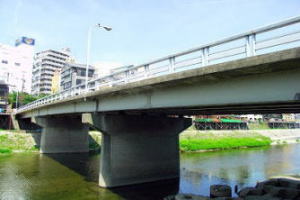 四条大橋の下流に団栗橋(どんぐり-ばし)がある。 ◆歴史年表 江戸時代、1709年、橋は記されている。(『京大絵図』) 1788年、天明の大火以前にすでに架橋されていたとみられる。 近代、1899年、西部が18m流出し、宮川筋が浸水する。 1923年、東端の一部、橋桁が流出する。 1935年、「昭和10年京都大洪水」により橋は流出した。 現代、1963年、現在の橋が架けられた。 ◆団栗橋 現在の団栗橋の架設年は、現代、1963年になる。橋種は3径間連続鋼プレートガーターになる。橋長61.5m、橋幅9.5m。 ◆新堤 鴨川西岸の西石垣(さいせき)通がある。西石垣の「垣」を略して西石(さいせき)とも呼ばれた。また、東岸の宮川町一丁目を俗称として石垣町と呼んだ。または東石垣町、略して東石(とうせき)とも呼んだ。また、東西をあわせて「石がけ」とも呼ばれた。これらの石垣の名は、江戸時代の「寛文新堤」に由来している。 江戸時代前期、1663年の鴨川大洪水以後、京都所司代・板倉内膳正矩(1617-1673)によって、今出川通-五条通までの鴨川西岸の9㎞区間に、「寛文新堤」(新土居、1669-1700)の石垣築造が行なわれた。この付近の石垣が築かれたのは1668年ともいう。鴨川両岸の石垣は1677年に完成している。 ◆天明の大火 団栗橋付近は、京都の歴史上最大の大火といわれる「天明の大火」(「団栗焼け」「団栗火事」「申年(さるどし)の大火」)と関わりがある。 江戸時代後期、1788年1月30日早朝、鴨川の東岸、団栗辻子(どんぐり-の-ずし)の民家(宮川町団栗新道角の両替商の空き家)から出火し、火は南東の風に煽られ宮川筋に南下した。さらに、火の手は折からの強風にあおられ、鴨川を越えて対岸(西岸)にも飛び火した。出火原因は放火とみられている。 火は、洛中の寺町通高辻にあった永養寺を類焼させ、北と南、西へも延焼した。火災は旧30日(太陰暦のため31日はない)から、旧2月1日-2日の2昼夜にわたって燃え続けた。 被災した範囲は、鴨川の東から、北は鞍馬口通、南は七条通、西は千本通の内までだった。類焼した町数は約1400町、市街地人口の5分の4(市街地の8割)が被災したともいわれている。なお、被害については諸説ある。焼失家屋は3万7000軒、罹災した世帯は6万5000ともいう。また、町数1430町、家屋65340軒、神社37、寺院201、死者140余人ともいう。(『翁草』) 御所、二条城、東西本願寺などの大規模な建築物をはじめ、200余の神社、900余の寺院も焼失している。 幕府は、機敏な対応をした。罹災者に対して米3000俵、銀600貫を貸与、物価高騰を厳禁した。 なお、御所の西にある新在家門は、普段は開かずの門だった。この大火の際に開門されたことから、火に焙られた蛤の口が開いた様に喩えられ、以後「蛤御門」と呼ばれるようになった。 天明の大火は、江戸時代最大の火災になり、室町時代後期の応仁・文明の乱(1467-1477)以来の大被害を及ぼした。このため、以後の京都の経済は衰微し、周辺の町並み・風俗にも影響を与えた。 ◆アユ 団栗橋の周辺では釣り人の姿を見かける。三条大橋から松原橋間は放流アユの友釣専用区になっている。 団栗橋西詰橋下には、賀茂川漁協団栗詰所がある。かつて水槽が置かれており、鴨川に生息するオイカワ、フナ、ハエ、ヤツメウナギなどを間近に観察することができた。 *年号は原則として西暦を、近代以前の月日は旧暦を使用しています。 *参考文献・資料 『京都の治水と昭和大洪水』、『京都水ものがたり 平安京一二〇〇年を歩く』、『昭和京都名所図会 2 洛東 下』、『京都の災害をめぐる』、 ![]() ![]() ![]() ![]() ![]() ![]() ![]() ![]() ![]() ![]() |