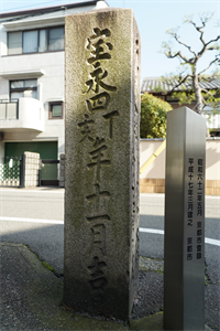 山科の御陵中内町(みささぎ-なかうち-ちょう)の旧東海道(旧三条通)沿いに、史跡「五条別れ道標(ごじょうわかれ-どうひょう)」が立てられている。石の道標は「三条通/五条橋道標」とも呼ばれている。 道標は江戸時代前期に立てられ、東海道を大津方面から来た旅人に、京都の五条・伏見方面への近道を示していた。 ◆歴史年表 江戸時代、1707年、旧11月、願主・沢村道範により道標は立てられる。 現代、1987年、5月1日、京都市登録史跡に指定された。 ◆沢村 道範 江戸時代前期-中期の大富豪・沢村 道範(さわむら-どうはん、17世紀末-18世紀初頭)。詳細不明。男性。京都・吉田界隈に住したという。大富豪であり、洛東・東海道筋に多くの道標を立てたという。 京都周辺では、江戸時代前期に「伏見・六地蔵道標」(1703年[元禄16年]) 、「今熊野観音道道標」(1705年[宝永2年])、「五条別れ道標(三条通/五条橋道標)」(1707年[宝永4年]) 、「坂本・唐崎・白川道道標(吉田本町道標)」(1709年[宝永6年]) などがある。 ◆道標 「五条別れ道標」(高さ155㎝)は、江戸時代前期、1707年旧11月に願主・沢村道範により立てられている。現代、1987年5月に、京都市登録史跡に指定された。 道標は「みちしるべ」とも呼ばれ、現在地から目的地への方向・距離・目的地への経由などの行先・距離が刻まれた石柱状のもので、街道の分かれ道などに立てられていた。「五条別れ」の「別れ」とは、京都独特の地名接尾語の表現であり、道の分岐点(わかれ道)を意味している。 碑文には、北面に「右ハ三条通」、東面に「左ハ五条橋 ひがし にし 六条大仏 今ぐまきよ水 道」、南面に「宝永四年(1707年) 丁亥 十一月吉日」、西面に「願主 沢村道範」とある。 この道標は、旧東海道を東の大津方面から来た旅人に対し、京中の三条通方面と五条・伏見方面への近道を示す役割を担っていた。東海道から別れて左(南)に折れ、渋谷越(しぶたに-ごえ、東山区)で五条大橋(下京区-東山区)方面へ出る道筋を教えていた。「ひがし」「にし」とは、東本願寺・西本願寺(下京区)を示している。「六条大仏」は「六条」「方広寺」(東山区)、「今ぐま」は今熊野観音寺(東山区)、「きよ水」は清水寺(東山区)を意味した。 山科盆地の東海道は、御陵(みささぎ)を経て、現在地の五条別れで渋谷越と分岐した。この峠の終着は五条大橋になり、五条別れの地名由来になった。旅人は、五条から南へは近道の渋谷越・滑石越(すべりいし-ごえ)を利用し、大仏・清水へは渋谷越、今熊野観音へは滑石越を経て辿った。 なお、「別れ」の表現としては、現在も京都市内のバス停名などに残っている。「野村別れ」・「百井(ももい)別れ」・「長谷(ながたに)別れ」・「柊野(ひらぎの)別れ」、「山田別れ」、「氷室(ひむろ)別れ」などがある。また、広島県には同様な「分れ・別れ」の表記が数多くあるという。高知県にも「分岐」「別れ(別レ)」などの表記が一部に見られるという。 ❊年号は原則として西暦を、近代以前の月日は旧暦を使用しています。 ❊参考文献・資料 『京都の地名検証』、『京都の道標』、ウェブサイト「京都のいしぶみデータベース-京都市」、ウェブサイト「会報№48-京都市文化観光示現保存財団」、ウェブサイト「京都市指定・登録文化財-史跡(山科区)」 、ウェブサイト「レファレンス協同データベース」、ウェブサイト「やましなを歩く-京都市山科区役所」、ウェブサイト「コトバンク」 ![]() ![]() ![]() ![]() ![]() ![]() ![]() ![]() |