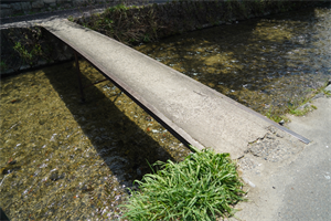 岡崎の仁王門通から南流する白川分水に、一本橋の通称「もっこ橋(ばし)」が架けられている。「白川桜小橋」とも呼ばれる。 かつて、付近に京都初の製氷工場があった。橋は、氷の保存に使った大鋸屑(おがくず)の運搬に使用されていた。 ◆歴史年表 近代、1877年、山田啓助は龍紋氷室京都工場(寺町二条)を創業した。 1898年、現在地付近に京都初の製氷工場「龍紋氷室」(左京区岡崎円勝寺町、現在のマンション「ポルト・ド・岡崎」付近)が完成する。この頃、もっこ橋も架橋されたとみられる。 1900年、本社は左京区岡崎円勝寺町に移る。 1901年、工場では機械製氷を始める。 現代、1980年、工場は閉鎖された。 2016年、12月、公開された映画「ぼくは明日、昨日のきみとデートする」に橋は登場した。 ◆山田 啓助 江戸時代後期-近代の実業家・製氷家・山田 啓助(やまだ-けいすけ、1844-1912)。男性。近江国蒲生郡馬淵村(滋賀県近江八幡市)の生まれ。父・宮村平太夫の5男。子・山田啓之助。 9歳で父と死別し、叔父・山田家に引き取られる。12歳で、伊勢松阪へ丁稚奉公に出た。22歳まで、伊勢伊賀間の行商人を手伝う。1867年、 兵庫開港に伴い神戸に移り、製茶貿易商の元に住み込む。新式銃・ゲーベル筒を輸入し、某藩への売り込みに成功し300両の利益を得た。以来、この資金をもとに貿易のブローカーになった。伯父の親戚筋、京都有栖川宮家家臣・山田奉膳家の養子になり、京都に移住する。京都市内で洋灯(ランプ)屋(寺町通二条上ル)を開業し、貸洋灯の制度を創業した。1871年、結婚する。有栖川家関係者で舎蜜局(せいみきょく)長の明石博高より新飲料水の知識を得て、「リモナード」缶詰卸売り(製造・店頭販売)を始める。果汁エキスの元祖・レモン水であり、清涼飲料水販売の先駆けになる。1876年、函館の天然氷が大阪を経由し京都に入り啓助は初めて「函館氷」を知った。1877年、天然氷を扱うものの商売は成功しなかった。京都市内の同業他社(奥田・樋口)と共同し、天然氷貯蔵倉庫(寺町通六角)を設営する。1878年、京都府庁職員・化学者・池田正三を知る。正三は、氷を夏中の熱病人の熱冷ましに用いることで、「人命救助」につながると諭した。啓助は、天然氷商品の有用性・重要姓に気づき、氷業に生涯を捧げることを決意した。1879年、神戸で氷を仕入れる。1880年、函館で300t余の天然氷「函館氷」を買い入れた。船運で神戸・弁天浜に陸揚げし、運送店の倉庫を改造し貯蔵した。京都へは、神戸より開通した鉄道便で送氷した。冬期貯蔵物は淀川から高瀬川の高瀬船便を利用した。以後2-3年、函館から天然氷(年間500-600t)を仕入れる。1904年まで、天然氷(毎年間560t)を函館から買い入れ、製氷池を探し販路拡張にも尽力する。1883年、自らが辰年生まれのため家号を「龍紋氷室」に定める。1884年以来3年間、京都・神戸・大阪・大津へ支店を出し、貯氷倉庫を設ける。1890年、「大阪凍氷株式会社」を買収し、河内・生駒山地区の製氷権を掌握した。京都では小野郷・八瀬地区の天然氷池を経営した。1892年、陸軍省所轄の函館五稜郭外濠の水面使用権を領有した。天然氷取扱の権利を公入札で獲得し、函館支店を設置し、大貯氷庫8棟も建設した。中川嘉兵衛が始めた五稜郭での採氷事業を継承する。1893年、東京支店を設置し、石作大貯氷庫を建設した。「龍紋氷」は大躍進する。1894年、機械製氷(人工製氷)の機運が勃興する。1898年、京都市に米国製の機械製氷工場(上京区岡崎町)を建設し、一昼夜20t(一カ年7000t)の生産能力を有した。以後、各地に貯氷庫を建設する。1907年、大阪支店に一昼夜50t(一カ年1万7500t)の製氷工場を建設した。1911年、東京支店に一昼夜60t(一カ年2万1000t)の生産能力の製氷工場建設し、その後、神戸支店・京都支店も増設した。1912年、長男・啓之助が家督を相続した。西須磨別邸(神戸市)で亡くなる。69歳。 氷の大衆化に尽力し、中川嘉兵衛に比して「西の氷王」といわれた。ほか材木業・倉庫業・海運業などにも携わった。 ◆池田 正三 江戸時代後期-近代の京都府庁職員・化学者・池田 正三(?-?)。詳細不明。男性。本名は有村幸助。子・猪之助。1885年、京都府庁出納局9等の頃、奄美大島の飢饉対策のために島に出向したという。1878年、府庁職員の時、人命救助に関わる氷の有用性について、実業家・山田啓助に説き、起業に影響を与えたという。 ◆もっこ橋 通称「もっこ橋」は、鉄製の一本橋であり、琵琶湖疏水から分流する白川分水から南に下った地点にある。北西から南東方向に架けられている。 近代、1898年の龍紋氷室の工場稼働時に架けられたとみられ、工場により架橋され、管理されていた。鉄製の桁を渡しており、天端はモルタルで舗装し、中央部分に1対の鉄製橋脚(直接基礎)がある。 「もっこ」とは持籠(もちこ)の促音化した言葉であり、「もっこう/もこ/もうこ」とも称され、「畚(もっこ)」とも記した。藁筵(わらむしろ)・藁縄などを網目状に編み四隅に綱を付け、天秤棒に吊り