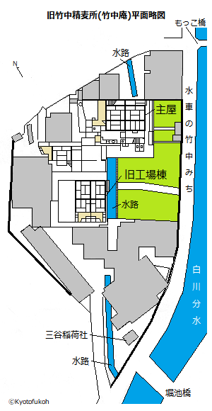 岡崎の琵琶湖疏水から南流する白川分水沿いに、「竹中精麦所跡(たけなか-せいばくじょ-あと)」がある。「竹中庵(ちくちゅう-あん)」とも呼ばれる。現在は、建物を改修しカフェ「時忘舎(じぼう-しゃ)」が営業している。 近代には、周辺の岡崎・夷川一帯は、琵琶湖疏水を利用した多くの水路、水力動力の水車を備えた工場地帯だった。 ◆歴史年表 近代、1890年、琵琶湖疏水が完成する。 1891年、「京都市有疏水水力使用条例」公布により、疏水の水力利用が始まる。水車用水使用申請第1号・2号同時に水路が許可された。 米商・山本熊次郎(下京区)は疏水から水路を引き、水車による精米を開始した。 その後、数人の土地所有者を経る。 1913年、敷地内に水路が作られ水車用水路として申請される。京都市で2番目に商用水路許可を取得した。 1914年、竹中亀吉は、水車動力により麦を精麦することを生業とし、竹中精麦所を創業する。 1916年、亀吉が水車跡地を購入し、5代目土地所有者として主屋・工場を整備する。 1917年、亀吉は疏水水力使用を申請している。竹中精麦所の水路は精麦所の大水車を回すために用いられる。 1940年、戦時下の食料管理法の強化などを理由に精麦工場は閉鎖される。 1944年頃まで、水車は確認されていたという。 現代、1945年以降、竹中家は貸家業を営んだ。 1965年/1970年頃、工場主要部分は解体される。 2014年、工場跡の改修工事が始まる。 2016年、旧竹中精麦所の区画保存のため、一般社団法人「水車の竹中保存会」が設立される。 2019年、3月、カフェ「時忘舎」が営業を始める。 ◆竹中 亀吉 近代の実業家・竹中 亀吉(?-?、たけなか-かめきち)。詳細不明。男性。滋賀県の生まれ。1914年、竹中精麦所を創業した。 ◆建築など 旧竹中精麦所の敷地は一反(300坪、1,000㎡)ある。東側は白川支流に沿う白川筋(水車の竹中径)に面し、板塀を設ける。現在は旧主屋(母屋)と旧精麦工場棟1棟の西側半分(奥側、後部)のみが残されている。これらの竹中家住居は「竹中庵(ちくちゅう-あん)」と呼ばれている。京都市の「歴史的風致形成建造物」に選定されている。 かつて、周囲には従業員の住居が点在していた。敷地南西端には三谷稲荷社(水車稲荷社)が祀られている。 ◈「工場棟」は、近代、1916年頃に2棟が建てられた。敷地の中央付近にあり、かつて水路上を跨いで建てられていた。内部の水路を利用し水車が設けられていた。 現代、1965年/1970年頃に、建物の老朽化に伴い、旧工場棟の主要建物は解体されている。旧工場棟の奥側半分は保存された。2014年に、工場跡の改修工事が始まる。旧工場棟は改修され、現在はカフェ「時忘舎」などに再利用されている。内部の柱・梁などは保存されている。取り壊された建物の前部跡は、現在は時忘舎の前庭になっている。 ◈ 「主屋(母屋)」は敷地の北東に現存している。近代、大正期(1912-1926)に建てられたとみられている。木造2階建の建物であり、町家建築様式の影響を受けている。屋敷型の農家型住宅であり、岡崎地区で農家型の類例はないという。 1階壁面より2階壁面が半間張り出し、1階を出桁造にしている。腕木一重で片持ちの大引より吊り金具で支持している。軒の出(1.5m)は深く平格子になっている。かつて、庇下の空間は製品の荷捌きにも使用されていた。 平面は、整形4間取で南側(土間境)の1列目が1間幅で2室(各4畳)あり、奥(北側)の2列目2個室の口の間になっている。正面(東側)4畳に西面・北面に差鴨居がある。天井は極太の棹縁を用いる。2列目は正面(東側)に座敷(6畳)、奥(西側)に和室(6畳)・階段がある。かつては、正面に仏間、奥は座敷になっていた。2階への階段は、当初は現在とは逆向きに付けられ、1階押入にかつての階段側面が残されている。 1階の下手側に2間土間がある。土間は前後で二分され、南側は通り土間・製品貯蔵庫になっている。壁面は湿気防止のためにブリキ内張りになっている。 かつては吹き抜けになっており、現在は床・天井を張る。南側妻面に開口部を設け、採光・煙出しに使用した。土間の南東隅に井戸を設けている。 土間奥に台所(ダイドコロ)があり、現在は、台所土間に床が張られている。床下には現在も水路が南流している。 2階はかつて、4間取で大広間としても利用されていた。精麦所の廃業後に貸間用の改修のため、階段の向きを変え中廊下にし、和室4室・洋室1室になった。南東隅にかつての本座敷(6畳)があり、長押を廻さず畳床(1畳)がある。床柱はトガを用いている。東側に縁・高欄が廻され、東側の眺望は白川・東山を望むことができた。 木造2階建、桟瓦葺、切妻造、平入。施行は安永工務店(左京区岡崎円勝寺町)。 東側に前庭(マエニワ)がある。かつて、疏水舟運により搬入された米・精麦製品の荷捌きのための空地として使用されていた。 ◈ 「三谷稲荷社(水車稲荷社)」は、敷地の南西端に現在も祀られている。水車・水路・一帯の安全祈願・商売繁盛などの信仰がある。 ◆竹中精麦所 近代、1890年、