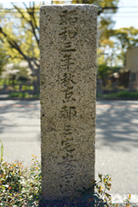 淀城跡公園の北西 、旧京阪国道に面して、「淀川瀬水車旧趾(よどのかわせ-の-みずぐるま-きゅうし)」の石標が立てられている。 かつて付近には、農業灌漑のための水車が設置されていた。 ◆歴史年表 室町時代(戦国時代)、淀の水車は設置されていたという。 安土・桃山時代、1586年、河村与三右衛門は水車を作った。 1623年、松平定綱の淀城の築城後に、水車の規模を大きくして使用した。 近代、1928年、秋、三宅安兵衛遺志により石標が立てられている。 現代、2013年、石標は南西方向へ約20mの現在地に移築された。 2016年、京都淀ライオンズクラブにより、「淀の水車」モニュメント(京阪淀駅前)が完成した。 ◆河村 与三右衛門 江戸時代前期の河村 与三右衛門(?-1615)。詳細不明。男性。初代過書船(かそぶね)奉行になる。1598年、豊臣秀吉より河村与三右衛門、木村惣右衛門は朱印状を受けた。 淀船などの河川交通に大きな力を持った。船は大坂と京都・伏見の間の貨客を運び、過書船は過書(通行手形)を所持する特権川船だった。 ◆佐川田 昌俊 安土・桃山時代-江戸時代前期の武士・歌人・佐川田 昌俊(さかわだ-しょうしゅん、1579-1643)。男性。佐河田、本姓は高階、通称は喜六、号は黙々、壺斎、不二山人など。下野国(栃木県)の生まれ。越後の武将・木戸元斎の養子になり、和歌・連歌を学ぶ。元斎の没後、永井直勝に見出され、次の尚政の家臣として仕えた。1638年、家督を譲り、一休寺傍らの「黙々庵(黙々軒)」に暮らした。著『松花堂行状記』。65歳。 飛鳥井雅庸(まさつね)、近衛信尋(のぶひろ)に和歌を学び、連歌・茶道にも優れた。林羅山・松花堂昭乗・小堀遠州・木下長嘯子・林道春らとの親交し、近世初期を代表する文人の一人になる。「吉野山花待つ頃の朝な朝な心にかかる峰の白雲」を詠んだ。一休寺の方丈庭園は昌俊・石川丈山・昭乗の合作とされる。 墓は田辺町大字薪にある。 ◆三宅 安兵衛 江戸時代後期-近代の商人・三宅 安兵衛(みやけ-やすべえ、1842-1920)。男性。初名は安治郎。若狭国(福井県)小浜の生まれ。父・陶器業「吉文字屋」・三宅清治郎、母・畑田つや。1850年、父没後、母とともに畑田家に身を寄せた。 1852年、京都五条の木綿商・井筒屋甚兵衛に奉公に入る。1857年、1864年の大火で店は類焼する。大坂の大菱屋喜助と連携し、京都で博多織を販売し井筒屋を救った。1867年、独立し、四条烏丸に博多織の京都での販売を独占し成功した。1869年、斎藤ゆか子と結婚し、3男2女を産む。その後、店は幾度か移転し、1882年、六角通高倉西入に移る。還暦後、隠居し京都周辺の名所旧跡を巡る。 1919年、長男・清治郎に金1万円を託し、「京都のために公益公利のことに使用せよ」と遺言した。78歳。 安兵衛は生前に石清水八幡宮・平野神社などに標石を立てている。安兵衛の没後、長男・清治郎は父の遺志に従い、京都府下に400基の史跡・名所の案内の石標を建立した。 墓は金地院(左京区)にある。 ◆石標 石標「淀川瀬水車旧趾」は、近代、1928年秋に三宅安兵衛遺志により立てられた。現代、2013年に南西方向へ約20m移築された。 碑文は東面に「淀川瀬水車旧趾」、西面に「昭和三年(1928年)秋 京都三宅安兵衛依遺志建之」と刻まれている。 高さ136×幅19×奥行20cm。 ◆水車 淀の地には古くより水車が設けられていたという。平安時代後期-鎌倉時代前期、12世紀(1101-1200)後半成立の『梁塵秘抄』には、「淀の川瀬の水車(みずぐるま) 誰をまつやら くるくると」と詠まれた。 室町時代(戦国時代)にも淀の水車は設置されていたという。 安土・桃山時代、1586年に淀水運支配・河村与三右衛門(?-1615)は、淀城の北側の桂川・宇治川の合流地点と、その下流側の庭園近くに、大小2つの筒車(揚水水車)を置いた。農業灌漑用であり、大は直径8間(14.5m)、小は6間(10.9m)あり、川の水を吸い上げていた。 なお、後に淀城が築造された地には、河村与三(惣)右衛門代々の屋敷があったと考えられている。(「淀下津町記録」)。 江戸時代前期、1623年に、松平定綱(1592-1652)は淀城を築城した。その後も水車の規模を大きくして使用し続けた。水車は淀城の泉水に水を送り、以後、江戸時代後期まで約300年維持された。永井尚政(1587-1668)は、佐川田喜六(昌俊)らに命じ水車を作らせた。宇治川より城内に水を引き入れた。 その後、大坂を中心に水車利用が普及したという。 ◆淀の水車のモニュメント 現代、2016年に京都淀ライオンズクラブにより京阪淀駅(伏見区)前に、「淀の水車」のモニュメントが完成した。 淀の水車は、淀城の庭園に水を引くために設けたという。江戸時代には、淀川は京都と大坂を結ぶ水路として活用された。船頭らは「淀の川瀬の水車 誰をまつやら くるくると」と歌い、地元の風物詩になっていた。 直径4m、スギ製。 ❊年号は原則として西暦を、近代以前の月日は旧暦を使用しています。 ❊参考文献・資料 ウェブサイト「京都のいしぶみデータベース-京都市」、ウェブサイト「奈良文化財研究所」、『京の