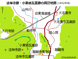 伏見区小栗栖(おぐるす)の竹林脇に、「法琳寺跡(ほうりん-じ-あと)」の石標が立つ。現在、石標の大半は埋没し「法琳」の一部しか判読できない。 かつて、大岩(おおいわ)山東麓、山科川に面した台地上に法琳寺はあった。この地に創建されたとみられる古代寺院だった。小栗栖寺とも呼ばれた。山科・醍醐地区での最古の寺院の一つになる。 真言宗であり、中世には衰退したという。 ◆歴史年表 創建、変遷の詳細は不明。 飛鳥時代、657年/7世紀半、第36代・孝徳天皇(597-654)、第37代・斉明天皇(594-661)の御願により、この地に堂塔4宇が建てられた。このうち、僧・定恵は太元堂を建てたという。(『山科名勝志』所載の『法琳寺別当旧記』)。法琳寺の前身になる。 奈良時代、前期(7世紀末)、法琳寺は創建されたとみられる。 平安時代、840年、旧6月3日、入唐の僧・常暁が山城国宇治郡の法琳寺に、大唐より招来した大(太)元帥の霊像を安置し、その秘法(大元帥法)を伝えたという。修法院として請い許される。(『続日本後紀』)。法琳寺は中興された。 斉衡年間(854-857)、第55代・文徳天皇御願の薬師堂が建ち、七仏薬師像が安置される。 864年、旧11月、常暁は没し、寺は大元師法を勤修する寺として相承された。(『法琳寺別当補任』『弘法大師弟子譜』『常暁請来録』『扶桑略記』『日本紀略』) 南北朝時代、1135年、醍醐寺理性院の賢覚が、大元別当(法琳寺別当)になる。賢覚は大元帥法を相承し理性院で勤修し、以後は理性院が大元帥法の根本道場になった。(『法琳寺別当補任』『醍醐寺新要録』) 中世(鎌倉時代-室町時代)、法琳寺は衰退したという。 鎌倉時代、1284年、旧6月13日、賊が法琳寺に入る。(『続愚史抄』) 1313年、旧2月4日、法琳寺太元堂/本尊は焼亡した。(『東寺王代記』『東寺長者補任』) 室町時代、法琳寺は退転する。大元帥法は唯一、醍醐寺・理性院に継承された。(『法琳寺別当補任』『醍醐寺新要録』) 江戸時代、1686年、この頃、この地にに醍醐寺・理性院派下の法琳寺名の寺院が残存していたとみられる。また、地元伝承では、江戸時代前期、北小栗栖村西山半腹の法琳寺旧跡に小堂が建ち、毘沙門天像を安置していたという。(『雍州府志』『山城名勝志』) 1711年、この頃までに法琳寺は廃寺になったとみられる。旧跡は北小栗栖の西の山上1町余にあった。かつて大元堂があり、今は小堂が建つという。(『山城名勝志』) 近代、1939年、京都大学文学部・梅原末治教授により、法琳寺瓦窯調査が行われる。 現代、 1972年、6月11日、洛東ライオンズクラブにより石標が立てられる。 1984年、古代學協会により、小栗栖瓦窯跡調査が行われた。 2000-2004年・2006年、京都橘女子大学(現・京都橘大学)文学部により、法琳寺跡などで礎石建物の測量・学術的発掘調査・地中レーダー探査などが行われた。 ◆定恵 飛鳥時代の僧・定恵(じょうえ、643-666/645-714)。詳細不明。男性。貞慧(じょうえ)。父・藤原(中臣)鎌足の長男。653年、遣唐大使・吉士長丹(きしの-ながに)に従い入唐、長安の慧日の道場に住し、神泰に師事したという。665年、唐の劉徳高(りゅう-とくこう)の船により帰国する。大和国(奈良県)大原で没した。23歳。 死因については百済人による毒殺ともいう。後世、第38代・天智天皇の落胤説がある。708年、帰国し、大和多武峯を開き、鎌足の遺骸を摂津国安威山(大阪府)より改葬し、十三重塔を建立しともいう。 ◆孝徳 天皇 飛鳥時代の第36代・孝徳 天皇 (こうとく-てんのう、597?-654)。詳細不明。男性。名は軽(かる)皇子、和風諡号を天万豊日(あめよろずとよひ)天皇。父・茅渟(ちぬ)王(第30代・敏達天皇の曽孫、第34代・舒明[(じょめい]天皇の弟)、母・吉備姫王(第29代・欽明天皇の孫)。女帝の第35代・皇極天皇の同母弟。中臣鎌足が天皇に接近し、天皇が厚遇したという。643年、旧11月、蘇我入鹿が山背大兄王を攻め滅ぼした際、天皇はその軍に加わっていたという。645年、旧6月に甥・中大兄皇子(第38代・天智天皇)らが蘇我蝦夷(えみし)・入鹿(いるか)父子を打倒した。この乙巳(いっし)の変後、第35代・皇極天皇の譲位を受け即位した。中大兄皇子を皇太子とし、646年/650年/695年、四ヵ条の大化改新の詔(みことのり)を発したともいう。(大化の改新)。646年末/651年、都を難波(大阪市)・長柄豊碕宮(ながらのとよさきのみや)に移した。長安京に模した日本初の都城だった。間人(はしひと)皇女(中大兄皇子の妹)を皇后とした。即位以前、妃・阿倍小足媛(おたらしひめ)との間に有間皇子が生まれていた。651年、難波長柄豊碕宮(なにわのながらのとよさきのみや)が完成する。653年、政権は分裂し、皇子は天皇の同意なく、皇極上皇・間人皇后以下公卿百官人を率い大和の飛鳥に戻る。天皇は、一人難波に残され退位を考えた。654年、旧10月、失意のうちに難波の宮殿で病死する。旧11月、河内(大阪府)の大坂磯長陵(おおさかのしながのみさざき)に葬られた。58歳?。 皇太子中大兄皇子、内臣(うちつおみ) ・中臣(藤原)鎌足らの補佐で