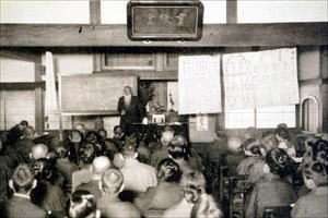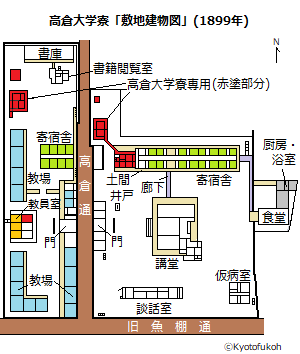 ![]() ![]() ![]() 説明板のプレート ![]() 旧講堂での日曜公演の様子(昭和期初期)、扁額「貫練堂」が掛けられている。 ![]() 旧講堂 ![]() 「敷地建物図」(1899年)の主な施設に加筆・彩色、掲示板より ![]() 【参照】「高倉通」の通り名、住所板より |