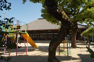 高倉通六条上ル富屋町、高倉魚棚(たかくら-うおのたな)と呼ばれた地に「高倉会館(たかくら-かいかん)」はある。 かつて、この地には、東本願寺の僧侶教育機関であり、大谷大学の前身になった高倉学寮(たかくら-がくりょう)が置かれた。現在は、学寮の旧講堂(現・高倉会館)が残されている。 ◆歴史年表 江戸時代、1755年、東本願寺学寮は現在地(高倉六条)に移転し、「高倉学寮」と称した。 1864年、幕末の兵火(禁門の変、蛤御門の変)で、学寮は本山・東本願寺両堂とともに焼失する。 1868年、学寮内近隣に「護法場」が設置された。 近代、1873年、学寮仮講堂を「貫練堂(かんれん-どう)」と称した。学寮は本山寺務所直轄になる。「講師」職を廃止し、「学師」を設置した。 1882年、「大学寮」と改称される。12月、講師職が再設置された。 1883年、「講堂(現・高倉会館講堂)」が新築再建され、聞法(もんぼう)道場になる。 1896年、講堂は、学寮と真宗大学の兼用になる。「真宗高倉大学寮」と称した。 1901年、真宗大学が東京巣鴨に移転した。 1907年、真宗高倉大学寮を「高倉大学寮」と改称する。2月、講師は役職から学階の一つに改められる。 1911年、学寮と東京から京都に移転した真宗大学が合併し、「真宗大谷大学」と称された。 1912年、大学は移転する。その後、旧講堂は荒廃する。 1913年、真宗大谷大学は、現在地(上賀茂小山)に移転し開設した。 1922年、5月23日、立教開宗700年記念事業として、旧講堂を改装し「高倉会館」が創立された。多田鼎、山辺温学、加藤智学、実業家・水口達らが尽力している。 1930年、高倉保育園(現・高倉幼稚園)が開園した。 ◆多田 鼎 近代の浄土真宗の学僧・多田 鼎(ただ-かなえ、1875-1937)。男性。法名は慶悟、諡号は信斯院。愛知県の生まれ。真宗大学在学中に、信仰の問題で煩悶する。東京の浄土真宗学僧・思想家・清沢満之を訪問した。1900年、鼎は真宗大学研究院を卒業した。のち清沢主宰の「浩々堂」同人になり、精神主義運動を進める。機関誌「精神界」の発行に携わる。1901年、清沢が真宗大学(現・大谷大学)学監になり、鼎は招かれ同教授に就任する。1903年、清沢の没後、辞職し、1904年、千葉教院を開く。その後、愛知県に帰り、三河同朋会を組織した。雑誌「みどりご」を刊行した。以後、著述、教化活動を展開した。1924年、真宗大谷派伝道院の初代院長に任じられる。著『正信偈本義』など。63歳。 ◆山辺 温学 近代の浄土真宗の学僧・山辺 温学(1882-1944)。詳細不明。男性。高倉学寮の講師だった。1922年、高倉会館の創立に尽力した。 ◆加藤 智学 近代の浄土真宗の学僧・加藤 智学(?-?)。詳細不明。男性。高倉学寮の講師だった。1922年、高倉会館の創立に尽力した。 ◆水口 達 近代の実業家・水口 達(?-?)。詳細不明。男性。越前鯖江・間部(まなべ)藩の武家の生まれ。一時は困窮し、30代で貿易業により財をなした。母の没後、常円寺(愛知県)の多田鼎のもとで聞法(もんぼう、仏教の教法を自己をむなしくして聴聞する)するようになる。荒廃した貫練堂の改装のために、学寮講師の山辺習学、加藤智学らとともに尽力した。多田は、水口に旧講堂の改装を依頼し、水口は多額の浄財を寄付する。1922年、高倉学寮の旧講堂は改装され「高倉会館」が創立した。 ◆達如 江戸時代後期の僧・達如(たつにょ、1780-1865)。男性。名は光朗、別号に愚泉など。父・乗如の5男。1792年、真宗大谷派20世をつぐ。1788年、天明の大火で焼失した東本願寺本堂・大門を、1615年に復興した。1835年、再度焼失した本堂を再建した。86歳。 ◆建築 高倉学寮には高倉通を挟み、教場、講堂、書庫・書籍閲覧室、教員室・事務所、談話室、寄宿舎、食堂、仮病室などが建てられていた。 ◈「講堂(現・高倉会館)」は、近代、1883年に新築され、1922年に改修されている。北側の寄宿舎とは廊下で繋がり、西面して建てられていた。 木造、平屋、寄棟屋根、瓦葺。 ◆扁額 旧講堂の堂内には、扁額「貫練堂」が掲げられている。東本願寺第20代・達如(1780-1865)の筆による。 「貫練群籍(群籍を貫練したまう)」(『仏説無量寿経』巻上3頁)に基づく。 ◆学寮・大谷大学 東本願寺の学問機関「学寮(がくりょう)」は、大谷大学の前身になる。 江戸時代前期、1665年に東本願寺寺内に「学寮」が創設される。1678年、学寮は渉成園(枳殻邸)内に移された。江戸時代中期、1755年に、学寮は高倉通魚棚に移され、「高倉学寮」と呼称された。以後、宗学研究・研鑽の場として隆盛し、全国寺院子弟らの教育の場として発展した。 近代、1868年に、 「護法場」が学寮内井波屋敷に設置される。国学・儒学・天学(天文地理)・洋教(キリスト教)、仏教を学ぶ場になった。1873年に、高倉学寮と護法場は「貫練場」と改称される。1874年、貫練場内に宗学・華厳・天台・倶舎・唯識・外学の6科の寮舎が設置される。1879年、貫練場は「貫練教校」と改称された。1882年に、貫練教校を改め、「真宗大学寮」と称する。1888年に、大学寮組織を改め兼
