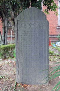 京都大学稲盛財団記念館の敷地北西に、「牧畜場記念碑(ぼくちくじょう-きねん-ひ)」、その左に「明治天皇行幸所牧畜場阯(めいじてんのう-ぎょうこうしょ-ぼくちくじょう-あと)」の石標が立てられている。 近代、京都府知事・長谷信篤の時、この地に勧業政策の一環として、牧畜場を開き西洋式牧畜を始めた。良種の牛・羊の繁殖、牛乳・乳製品製造、羊毛販売などが行われていた。 地方公共団体が開いた牧場としては日本初といわれている。 ◆歴史年表 歴史年表 近代、1871年、9月、京都府は官営牧畜場の設立を計画する。山城国(京都府)中に牧牛の奨励を布告し、政府に米国産牛買入伺書を申請した。10月、許可され、牧畜場用地として愛宕郡吉田村聖護院の旧練兵場敷地の払下方を大蔵・兵部両省に申請する。 1872年、2月8日、同地の鴨川東畔(現、左京区吉田阿達町)の払下を受け、「官立京都府牧畜場」を設置した。米国より輸入した牛 ・羊の飼育を始めた 。その際、輸入牛の付添人として来日した在米ドイツ人・ジョンソンが農牧の務に従事した。 1873年、5月/3月、米国人・ジェームズ・オースタイン・ウィードを「京都府御用地」に農牧教師として雇い入れ、農牧学を講じさせ実地に経験させた。11月、正式に「牧畜場」と称し、ウィードに農学牧事を教授・指導させた。 1874年、牧畜場は火災になる。 1875年、6月、京都博覧会に出品し、有功賞銅牌を受けたという。 1876年、10月、京都府は、出張所を船井郡須知村の金剛寺に置く。丹波国蒲生野(がもうの)荒蕪地に分場を開墾し、10月/11月、農牧学校を設立した。 1877年、2月1日、第122代・明治天皇の関西行幸の際に、牧畜場にも行幸があった。 1879年、 5月、ウィードの任期満了とともに牧畜場は廃校になる 。6月、牧畜場は家畜・土地建物一切が、京都市の小牧仁兵衛ら3 民間人へ払下げられる。「京都牧畜場」へと変更される。 1880年、12月、牧畜場記念碑は当年に建立する予定で碑文が書かれた。実際には立てられなかった。 1881年、京都牧畜場は七条停車場裏に「京都牧畜場分畜場」を増設する。 1901年、日清戦争・日露戦争による大不況のあおりを受け牧畜場は破産する。京都府所有の牧場も閉鎖になった。 1906年、京都府は、府議会の議決を経て、現在の京丹波町に新たに種畜場を設置した。乳牛・和牛の繁殖・譲渡・試験研究を再開した。 1935年、京都府は、綾部市の現在地に種羊場を設置した。その後、統廃合を行い、現在の「畜産センター」になった。 1938年、京都府により「明治天皇行幸所牧畜場阯」が、現在地付近に立てられた。 1941年、4月、京都搾乳畜産組合により「牧畜場記念碑」が、現在地付近に実際に立てられる。 現代、2008年、京都大学稲盛財団記念館の竣工に伴い、「牧畜場記念碑」「明治天皇行幸所牧畜場阯」2基が現在地に移設された。 ◆長谷 信篤 江戸時代後期-近代の公卿・華族・政治家・長谷 信篤(ながたに-のぶあつ、 1818-1902) 。男性。号は騰雲、梧園、梧岡。 父・高倉永雅。平氏西洞院支流・長谷信好の養子。1858年、日米修好通商条約調印の勅許に反対した尊攘派公卿のひとりだった。国事御用掛、議奏にすすむ。1863年、八月十八日の政変で一時失脚する。1868年、王政復古の大号令に伴い、東久世通禧、岩倉具視らと新政府三職の一つである議定に就任した。1868年-1875年、京都府初代知事に就く。1890年-1902年、貴族院議員になった。85歳。 元老院議官、子爵。 ◆明石 博高 江戸時代後期-近代の医師・化学者・衛生学者・殖産家・明石 博高(あかし-ひろあきら、1839-1910)。男性。名は博人、号は静瀾。京都の生まれ。父・代々の医薬舗「浩然堂」を営む弥三郎、母・浅子。5歳で父が亡くなる。外祖父・蘭方医・松本松翁に育てられ、西洋医術・化学製薬術を学ぶ。14歳頃、桂文郁に古典医学を学んだ。宮本阮甫・武市文造にオランダ語、柏原学介に物理学、錦小路頼徳に解体術、主に新宮凉閣に解剖・生理・薬物・臨床医学、新宮凉民にも学ぶ。田中探山に本草学、辻礼甫に化学・製薬術・測量術を学んだ。1865年、京都医学研究会を創設した。1866年、公家・錦小路頼言(にしきこうじ-よりあき)に入門し、医道免許を受けた。自宅で理科学研究会「煉眞舎(れんししゃ)」を主宰し、理化学・薬学を研究した。1868年、博高は頼言に建議し御所内病院(烏丸一条下ル、施薬院三雲宗順宅)を開設し、医務を担当した。戊辰戦争の死傷者救済を行う。1869年、煉眞舎を三条通室町に移す。大阪・浪華仮病院を創設し、薬局主管・看頭になる。オランダ人・ハラタマ、ボードインらを招く。大阪舎密局のハラタマの助手も務める。1870年、煉眞舎は三井別邸に移る。京都府参事・槇村正直の誘いで京都府に出仕した。京都舎密局を創設し、局長になった。1871年、勧業掛になり、主吏に就く。1874年、京都で日本初の医師免許試験の実施を提言した。1877年、コレラの流行に際して、再流行を予言し検疫制度の採用を提案する。1881年、府知事・北垣国道に代わっ
