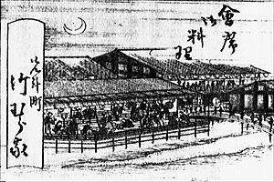 ![]() 鴨川西岸、竹村家橋跡 ![]() 竹村家橋跡の石組(上段)、下段はせせらぎ川の石垣 ![]() 竹村家橋跡とみられる石組 ![]() 脚台跡らしきものを上から見下す ![]() 竹村家橋跡から東側の景色、手前がせせらぎ川、鴨川河川敷、奥に鴨川 ![]() 竹村家橋跡に通じる行き止まりの小路(鍋屋町) ![]() 【参照】「先斗町竹むら屋」の広告、右端に橋の一部が描かれている。左手には川床が見えている。『京の三名橋 四条大橋 中』より ![]() ![]() 【参照】地蔵尊、鍋屋町 ![]() 【参照】先斗町 ![]() 【参照】先斗町通 ![]() 【参照】先斗町通 ![]() 大和橋 ![]() 江戸時代後期、「花洛名勝図会」(1864年)に描かれた大和橋・白川、橋の説明板より ![]() 白川 ![]() 旧車道 |