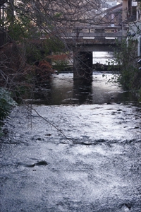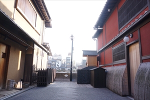 かつて「竹村家橋(たけむらけ-はし)」という木造橋が、四条大橋西岸北に架かっていた。橋の西詰にあった料亭「竹村家」が、私費で架けたことからこの名が付いた。 本名は「車道橋(くるまみち-はし)」と呼ばれ、橋近くに鴨川に入る車道があった。 ◆歴史年表 竹村家の詳細不明。竹村家橋の架橋年も不明。 近代、1895年、6月、鴨川洪水により橋が流失した。(『京都の治水と昭和大水害』) 1899年、9月、鴨川洪水により橋の東部14mが流失する。(『京都の治水と昭和大水害』) 1935年、6月、「鴨川大洪水」により流出し、その後の鴨川改修で消滅したという。(『京の三名橋 下 五条大橋』) その後、竹村家は廃業している。(『京の三名橋 中 四条大橋』) ◆竹村家橋 ◈木造の竹村家橋の架橋年は不明という。四条大橋の北一町(100m)ほどの所に架けられていた。本名は「車道橋(くるまみち-はし)」と称した。橋の西詰、先斗町(ぽんと-ちょう、実際の町名は鍋屋町)にあった料亭(懐石料理屋)「竹村家」が私費で架けたことからこの名が生まれた。周辺にはほかに、「松村屋」「梅村屋」などの料亭があったという。 竹村家橋は、長さ46間(83.6m)、幅1間1尺(2.1m)あった。鴨川西岸の先斗町から対岸(東岸)の川端町に通じていた。四条河原の夕涼みに不可欠な橋であり、橋の東から6分位のところに、河原に降りる掛け橋が設けられ、手摺も付けられていた。橋は鴨川洪水の度に流されたという。近代、1935年6月の「鴨川大洪水」により流出し、その後の鴨川改修で消滅したという。以後、架け替えられなかった。 後に竹村屋は廃業し、跡地には鶏肉(かしわ)料理屋「菊水」が入った。後に、これも廃業したという。その後、お茶屋になったという。現在は、路地になっている。 ◈鴨川には牛馬が曳く荷車の通る車道が、荒神橋、三条大橋、四条大橋にあった。当時の荷車には鉄輪がはめられていたため、木橋を通ると損傷しやすいとして、荷車は橋を渡れず橋下で渡河していた。 四条大橋での車道は、橋の上流と下流に橋に並行してあったという。竹村屋橋近くの車道は、鴨川東岸の北東方向にある縄手通に架かる大和橋南詰を西へ進み、北東から南西に流れる白川の流れに沿っていた。鴨川に差し掛かると竹村屋橋の東橋詰上流から河原に下り、鴨川を渡って竹村屋橋の西橋詰から上っていった。 ◆竹村橋跡 竹村屋橋の跡としては、次のものがある。 ◈四条大橋の鴨川西岸上流、先斗町(鍋屋町)側に東西方向の小路があり、西側は先斗町通と交差し、東側は行き止まりになっている。付近はかつて、橋の西詰に当たっていた。現在は脇に地蔵尊が祀られている。 鴨川側から見ると、みそそぎ川の石積の上に、川床の空白地があり、脚台跡らしき石張り(長さ196-198㎝、幅12㎝、厚さ8-9㎝)が残されている。 ◈鴨川東岸側では、大和橋(東山区繩手通四条上ル)の南詰に、白川に沿う形で西に入る小路がある。かつて、この小路の俗称は「車道」だったという。車道から、現在の川端通に出て左折したところが竹村家橋の東詰だったという。 ❊年号は原則として西暦を、近代以前の月日は旧暦を使用しています。 ❊参考文献・資料 『京の三名橋 中 四条大橋』、『京の三名橋 下 五条大橋』、『京都・鴨川と別子銅山を歩く』、『京都の治水と昭和大水害』、ウェブサイト「コトバンク」 |