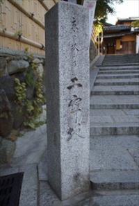 二年坂(にねん-ざか)は、二寧坂(にねい-ざか)とも呼ばれている。東山通の東の南北に通じた道で、三年坂(産寧坂)の北に続く坂道をいう。三年坂に較べてやや小ぶりの坂という意味もある。竹久夢二が住んだ。 ◆歴史年表 平安時代、804年以来、すでに二寧坂と呼ばれていたともいう。 江戸時代、1758年、桝屋善兵衛が官の許可を得て、この付近の開拓地にしたという。以後、この周辺は桝屋町の町名になる。(『坊日誌』) 近代、大正期(1912-1926)、現在の家並みになった。 1917年、2月1日、画家・竹久夢二が二年坂(桝屋町)で次男・不二彦と生活を始めた。 現代、1976年、周辺は、伝統的建造物群保存地区に指定されている。 ◆二年坂 二年坂の名の由来については、産寧坂の呼び名が三年坂になり、その関連で二年坂になったともいう。さらに、一年坂(一念坂、一寧坂)も生まれた。 平安時代前期、804年以来、すでに二寧坂と呼ばれていたともいう。 ◆町並み 近代、大正期(1912-1926)に現在の家並みになった。周辺は、伝統的建造物群保存地区(1976)に指定されている。石段、石畳の道、むしこ造り町家、本二階建町家などが軒を連ねている。 ◆市電の敷石 かつて市電の路面に使用されていた敷石(御影石)は、市電全廃後に各所で転用された。石畳としては、二年坂、産寧坂(三年坂)、石塀小路、新橋通、哲学の道などで再利用されている。 ◆アニメ ◈劇場版アニメーション『名探偵コナン 迷宮の十字路』(原作・青山剛昌、監督・こだま兼嗣、制作・トムス・エンタテインメント、2003年4月)の舞台になった。 ◈アニメーション『暗殺教室』(原作・松井優征、監督・岸誠二、制作・Lerche、第1期2015年1月-6月、第2期2016年1月-7月、第1期全22話、第2期全25話)に坂付近が舞台になる。第8話で修学旅行中に「殺せんせー」が登場する。 ❊原則として年号は西暦を、近代以前の月日は旧暦を使用しています。 ❊参考文献・資料 『昭和京都名所図会 1 洛東 上』、『京都大事典』 、ウェブサイト「都市史28 京都の市電-京都市」、ウェブサイト「コトバンク」 ![]() ![]() ![]() ![]() ![]() ![]() |