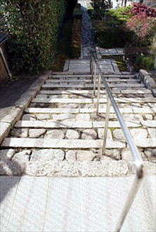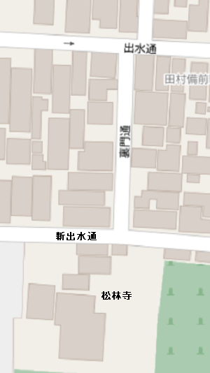 松林寺(しょうりん-じ)のある分銅町(ぶんどう-ちょう)は、かつて内野(うちの)と呼ばれた。平安時代に平安宮内裏が置かれ、安土・桃山時代には聚楽第の外堀の一郭があった。 「やす寺」ともいわれる。「やす」は、安産の「安(やす)」に由来しているという。山号は龍護山という。 浄土宗鎮西派。本尊は阿弥陀如来。 ◆歴史年表 安土・桃山時代、1587年、現在地一帯に豊臣秀吉は聚楽第を完成させた。 江戸時代、1608年、僧・清印により創建された。当初は東山黒谷(左京区)にあった。 以伝の時、洛陽川原町(中京区)に移転する。 元禄年間(1688-1704)、信誉の時、二条河原町より現在地(中京区)に移転したという。 現代、1995年、境内で発掘調査が行われる。 ◆清印 江戸時代前期の僧・清印(?-?)。詳細不明。1608年、東山黒谷(左京区)に松林寺を開山した。 ◆佐々木只三郎 江戸時代後期の武士・佐々木只三郎(ささき-たださぶろう、1833-1868)。男性。名は泰昌、号は高城。江戸の生まれ。父・会津藩(福島県)藩士・佐々木源八の3男。会津藩士・手代木勝任(てしろぎ-かつとう)の弟。幕臣・佐々木弥太夫の養子になり高城と改名した。1863年、上洛浪士組の取締並出役になる。浪士組を尊攘運動に利用しようとした清川八郎を、江戸麻布赤羽橋で暗殺し、その指揮をとったという。1864年、京都見廻組に転じ、組頭になる。1867年、坂本龍馬暗殺の指揮をしたという。1868年、鳥羽・伏見の戦で被弾負傷した。大坂から和歌山・紀三井寺へ後送され死去した。36歳。 ◆本尊 本堂に祀られている本尊の阿弥陀如来は、飛鳥時代、厩戸王(聖徳太子、574-622)の作という。 ◆蘇命散 かつて寺では「蘇命散」という薬を処方販売していた。日野家より伝えられたという。婦人病、安産、産前産後の効験があった。 開山の清印の母が重病になり、母の回復を祈願した。薬師如来が顕れ、婦人病・安産に効験あらたかな秘薬「蘇命散」の処方を伝授したという。 近代、太平洋戦争(1941-1945)前まで、寺でもこの妙薬が売られていたという。 ◆キリシタン墓石 境内本堂前に「やすでら/やそでら」と刻まれた石碑が立つ。「やすらかな安産を祈願する寺」の意味と伝えられていた。 また、「やす」とは耶蘇(やそ)を表し、キリシタン寺の意味もあったともいう。かつて墓地には墓碑に十字架が刻まれたキリシタン墓石があった。19世紀(1801-1900)中頃のものと推定されている。 現代、2004年/2005年に洛西バプテスト教会(〒604-8457 京都市中京区西ノ京馬代町16-9)に遷された。 ◆平安宮 寺は平安宮内裏跡にある。周辺には、内裏弘徽殿、承香殿、昭陽殿などが建ち並んでいた。 境内地には、平安京内裏の外郭門の一つ建春門(けんしゅん-もん)があったという。内裏東側の正門で内郭宣陽門(せんよう-もん)に相対していた。別称として「左衛門の陣」とも呼ばれ、左衛門府の武官が陣を設け警固にあたった。「外記門(げきもん)」とも呼ばれた。 ◆聚楽第 境内は、安土・桃山時代に築造された聚楽第(1587-1595)の南外堀跡(外郭南堀、天秤堀遺構)と推定されている。 聚楽第は、関白・豊臣秀吉(1537-1598)の政庁・邸宅であり、平安宮の跡地に建てられた。天守、内郭、外郭があり、二重の堀が巡らされた平城の機能も備えていた。 松林寺門前の東西通りの新出水通は、その北の東西通りの出水通より3.5mほど低い位置にある。さらに境内は東西の新出水通より1mほど下がった窪地に建つ。このため、山門から境内へは急な下り坂になっている。また、門前の南北通りである裏門通も南に向かって緩やかな下り坂になっている。 境内付近の落込み部分は、聚楽第の外堀遺構とみられている。低部は聚楽第本丸の南西にあった一番外の南外堀跡とされ、後に埋め戻されている。 なお、地名の「分銅町(ぶんどう-ちょう)」は外郭水路の呼称「分銅堀」に、周辺に複数ある町名「天秤町(てんびん-ちょう)」も堀の呼称「天秤堀」に由来しているという。 ◆発掘調査 現代、1995年に、聚楽第外郭南堀とみられる境内の東側延長線上で発掘調査が行われた。 平安時代の大型井戸、近世の聚楽土の土取り土坑が確認された。聚楽第堀跡は見つからなかった。敷地北側に堀の埋土があり、この地点で堀が屈折していた可能性もあるという。 ◆見廻組 幕末の見廻組屯所が境内にあったという。江戸時代後期、1864年に、江戸幕府は京都守護職で会津藩主・松平容保配下に見廻組を置き、主に御所や二条城周辺を管轄し警固した。 組頭(与頭)・佐々木只三郎(1833-1868)は寺に家族とともに下宿していた。坂本龍馬(1836-1867)・中岡慎太郎(1838-1867)の近江屋での暗殺について密議を行ったという。 *年号は原則として西暦を、近代以前の月日は旧暦を使用しています。 *参考文献・資料 『京都・山城寺院神社大事典』、『京都歴史案内』、『京都隠れた史跡100選』、『京のキリシタン史跡を巡る 風は都から』、『京都幕末維新かくれ史跡を歩く』、『上京幕末「大政奉還その前夜」』、『京都 秀吉の時代-つちの中から』