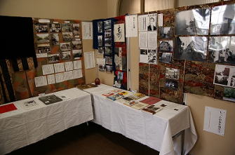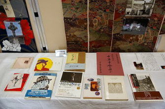 ![]() 中也の唯一残る下宿跡、非公開 ![]() 小さな窓が「スペイン風」? ![]() NPO京都中也倶楽部によって催された中也展より ![]() 中也の研究書と右上は遺品の着物 |