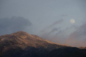 ![]() 「木屋町に宿をとりて 川向の御多佳さんに 春の川を隔てて男女哉 漱石」 ![]() 比叡山に昇る冬の月 「橋の真中に立って鴨川の水を眺めた。 東山の上に出る静かな月を見た。そうして京都の月は東京の月よりも丸くて大きいように感じた。」(『門』) |